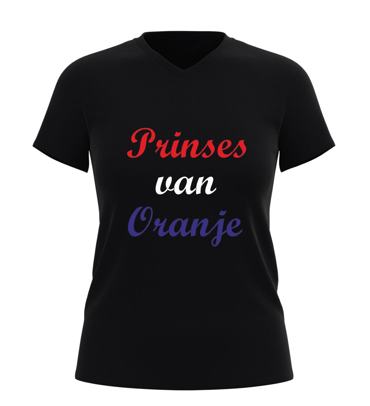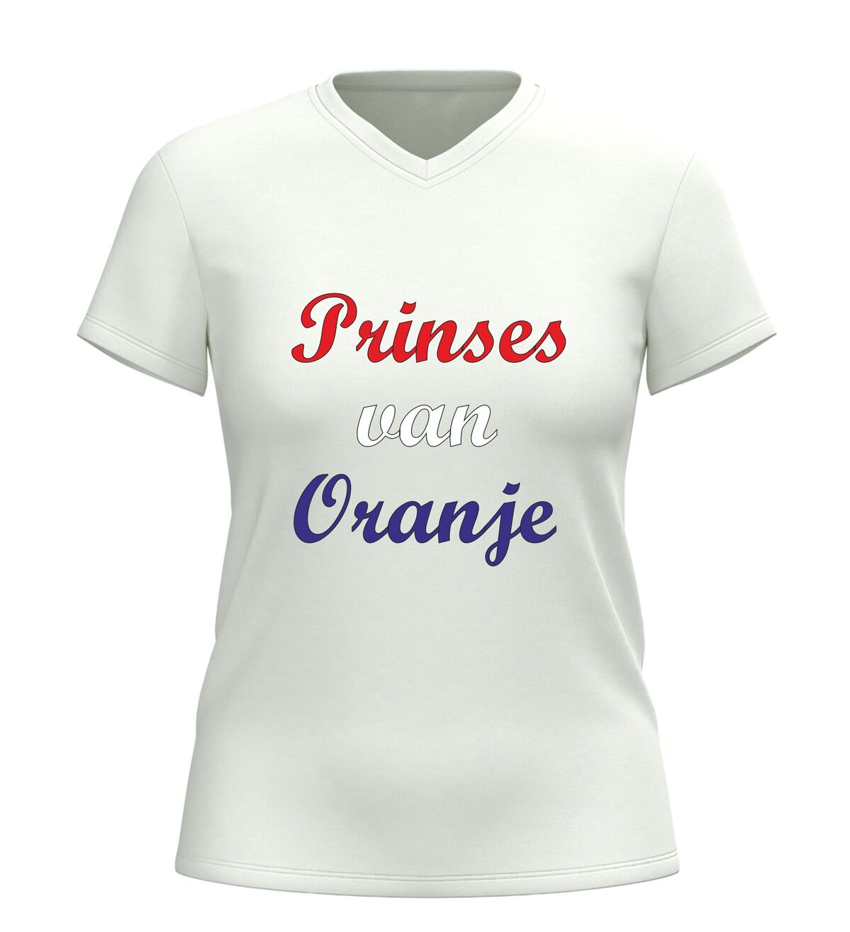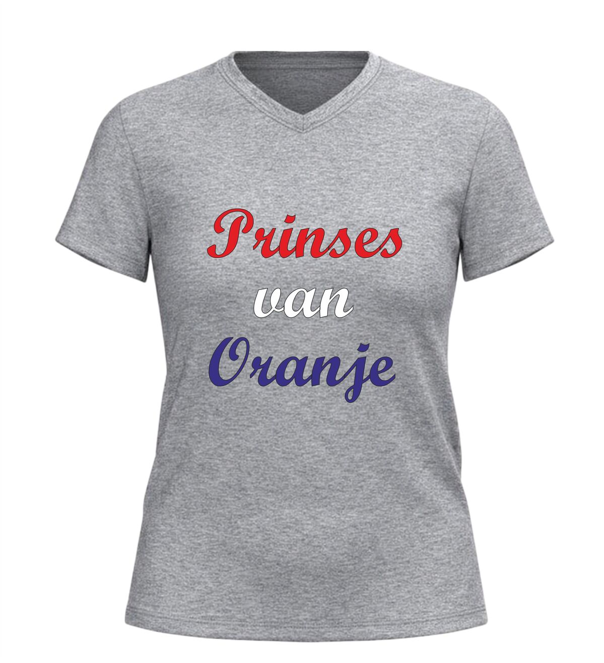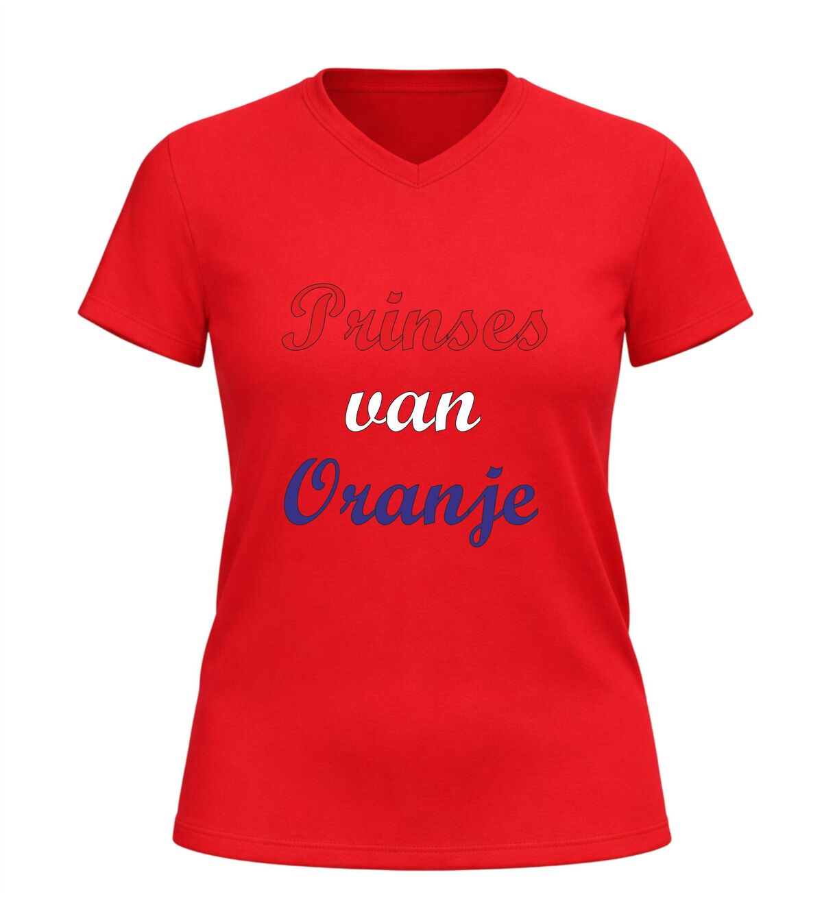 Laat jouw Nederlandse trots zien met dit stijlvolle dames V-hals T-shirt met de tekst Prinses van Oranje in de kleuren rood, wit en blauw. Dit comfortabele dames shirt is perfect om te dragen tijdens Koningsdag, een voetbalwedstrijd van het Nederlands elftal, een festival of andere Hollandse feestdagen. Dankzij de vrouwelijke pasvorm en de zachte stof zit het shirt niet alleen mooi, maar ook erg comfortabel.