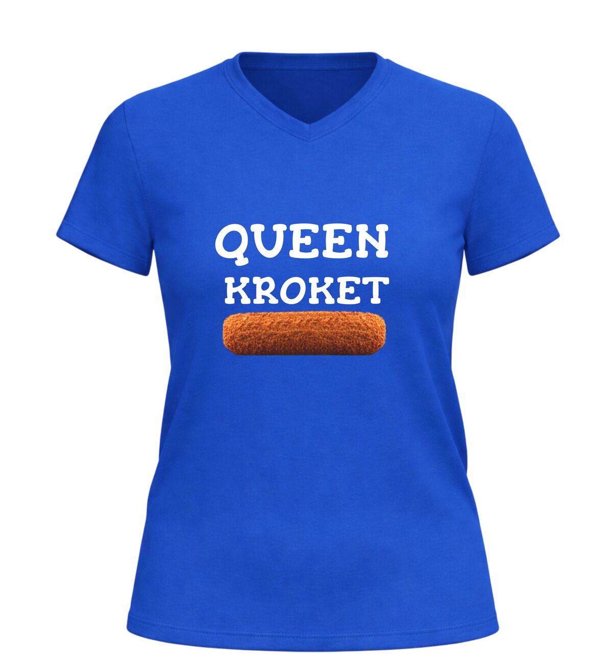 Dit dames v hals t-shirt met queen kroket opdruk is een must-have voor vrouwen die houden van humor en een knipoog naar de Nederlandse snackcultuur. Het shirt is voorzien van een vrouwelijke v-hals en een opvallende print met de tekst queen kroket en een duidelijke afbeelding van een kroket, wat zorgt voor een speelse en herkenbare uitstraling. Dit grappige dames T-shirt is perfect om te dragen tijdens festivals, feestjes of gewoon als casual outfit. Dankzij de comfortabele pasvorm en het zachte draaggevoel combineert dit V-hals shirt met kroket print stijl en plezier moeiteloos. Het queen kroket t-shirt is daarnaast een origineel cadeau voor een kroketliefhebber, snackfan of iemand met gevoel voor humor.