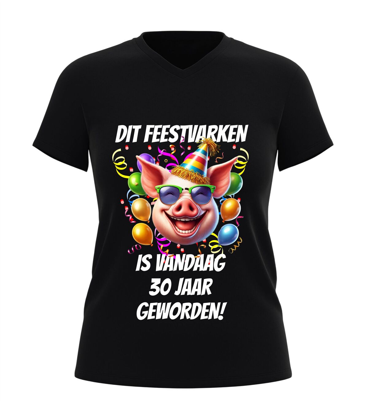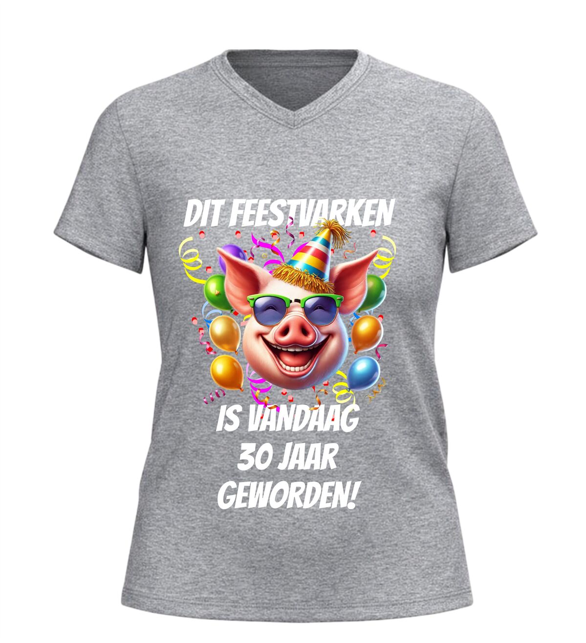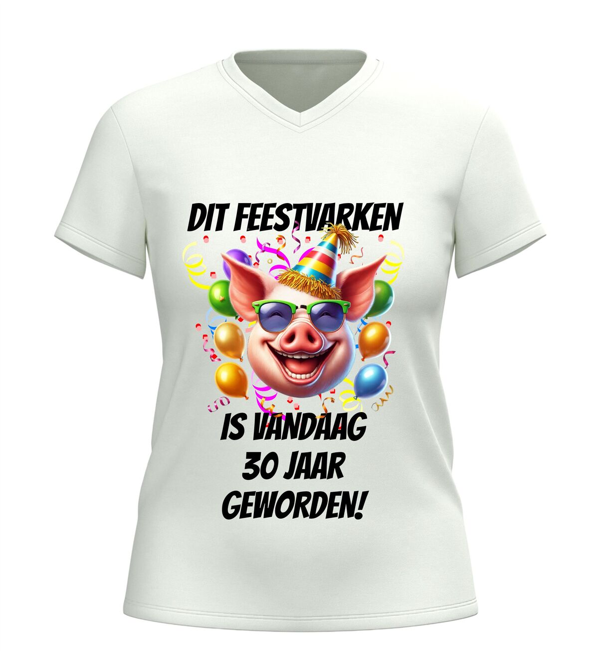 Vier deze bijzondere mijlpaal in stijl met dit v-hals dames shirt met de tekst dit feestvarken is vandaag 30 geworden en een vrolijke afbeelding van een feestelijk varken. Dit grappige dertig jaar verjaardag shirt is perfect voor wie haar dertigste verjaardag niet ongemerkt voorbij wil laten gaan. De combinatie van de speelse tekst en het feestelijke varken met party-uitstraling zorgt direct voor een lach en maakt de jarige het stralende middelpunt van de dag.