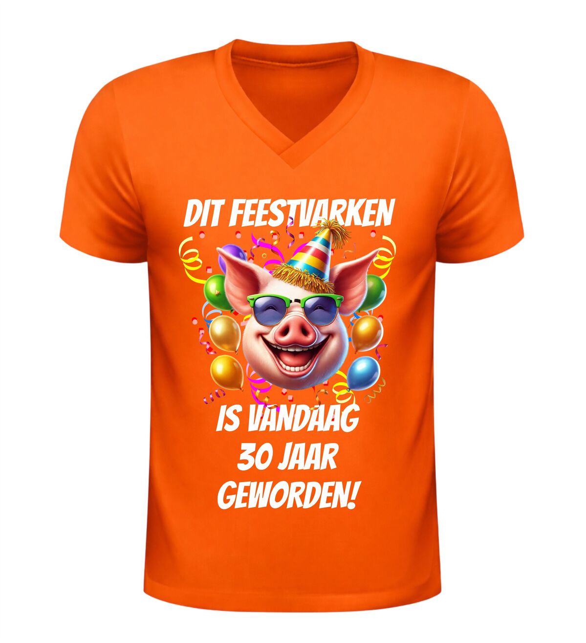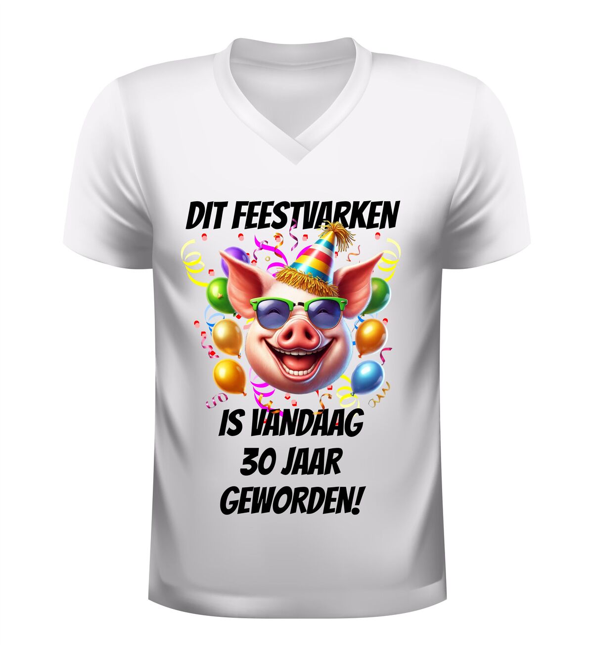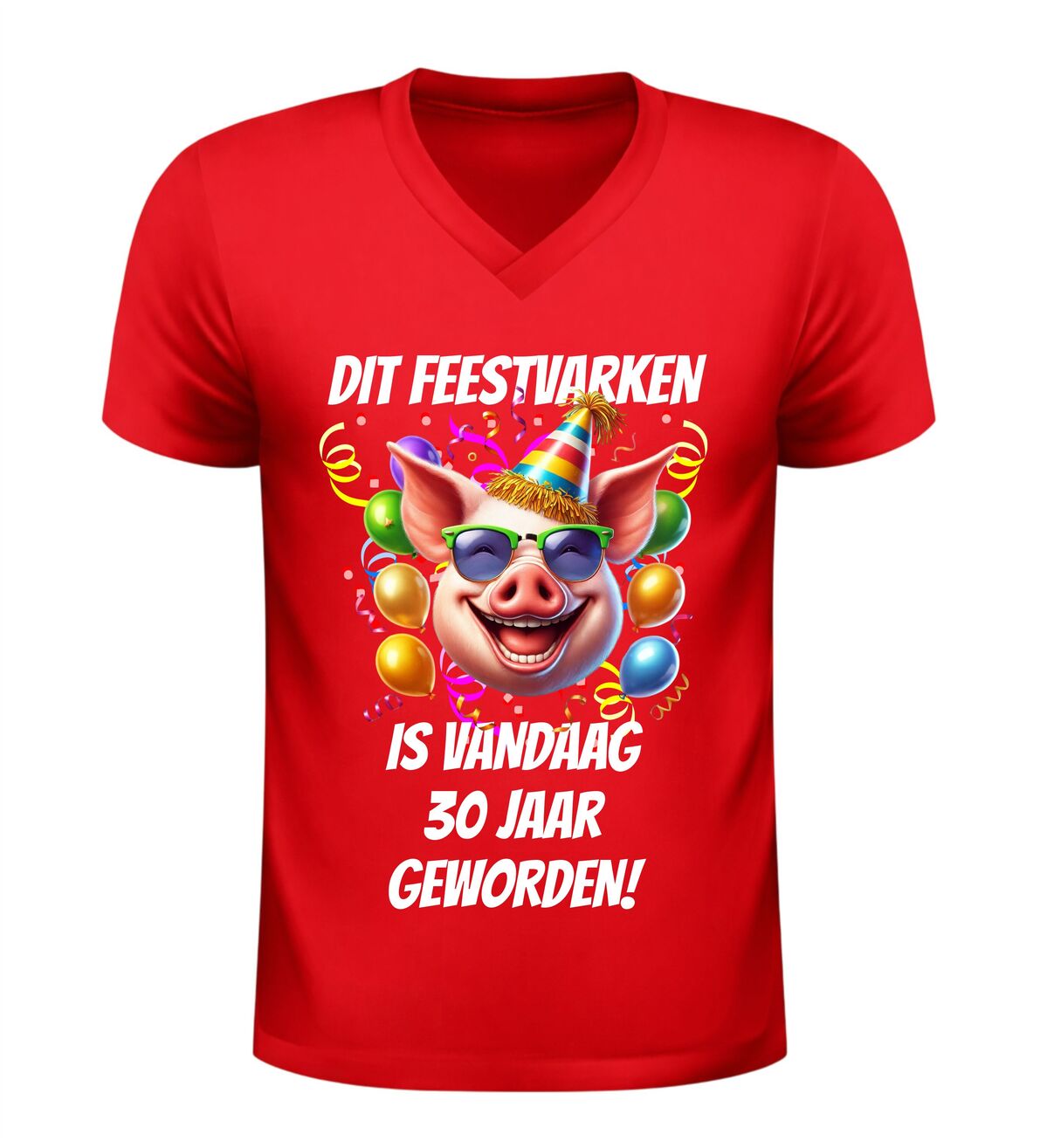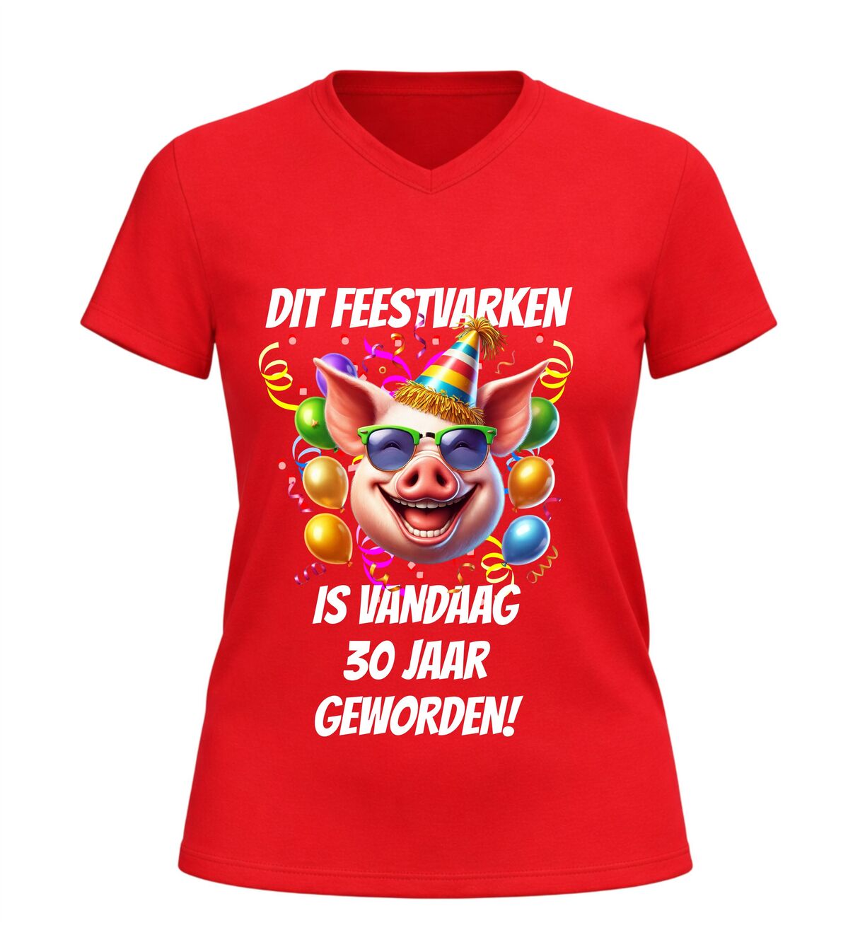 Vier deze bijzondere mijlpaal in stijl met dit v-hals dames shirt met de tekst dit feestvarken is vandaag 30 geworden en een vrolijke afbeelding van een feestelijk varken. Dit grappige dertig jaar verjaardag shirt is perfect voor wie haar dertigste verjaardag niet ongemerkt voorbij wil laten gaan. De combinatie van de speelse tekst en het feestelijke varken met party-uitstraling zorgt direct voor een lach en maakt de jarige het stralende middelpunt van de dag.