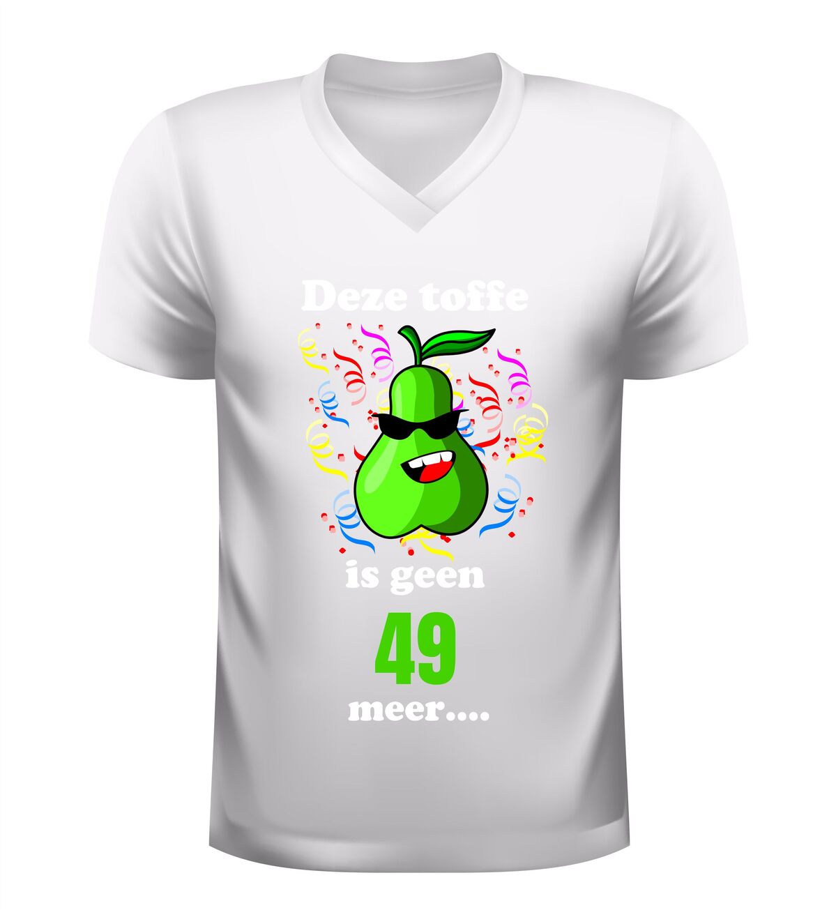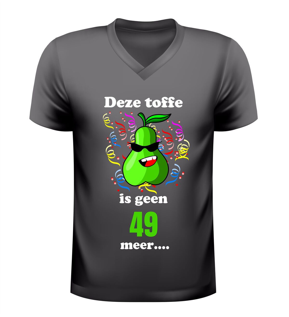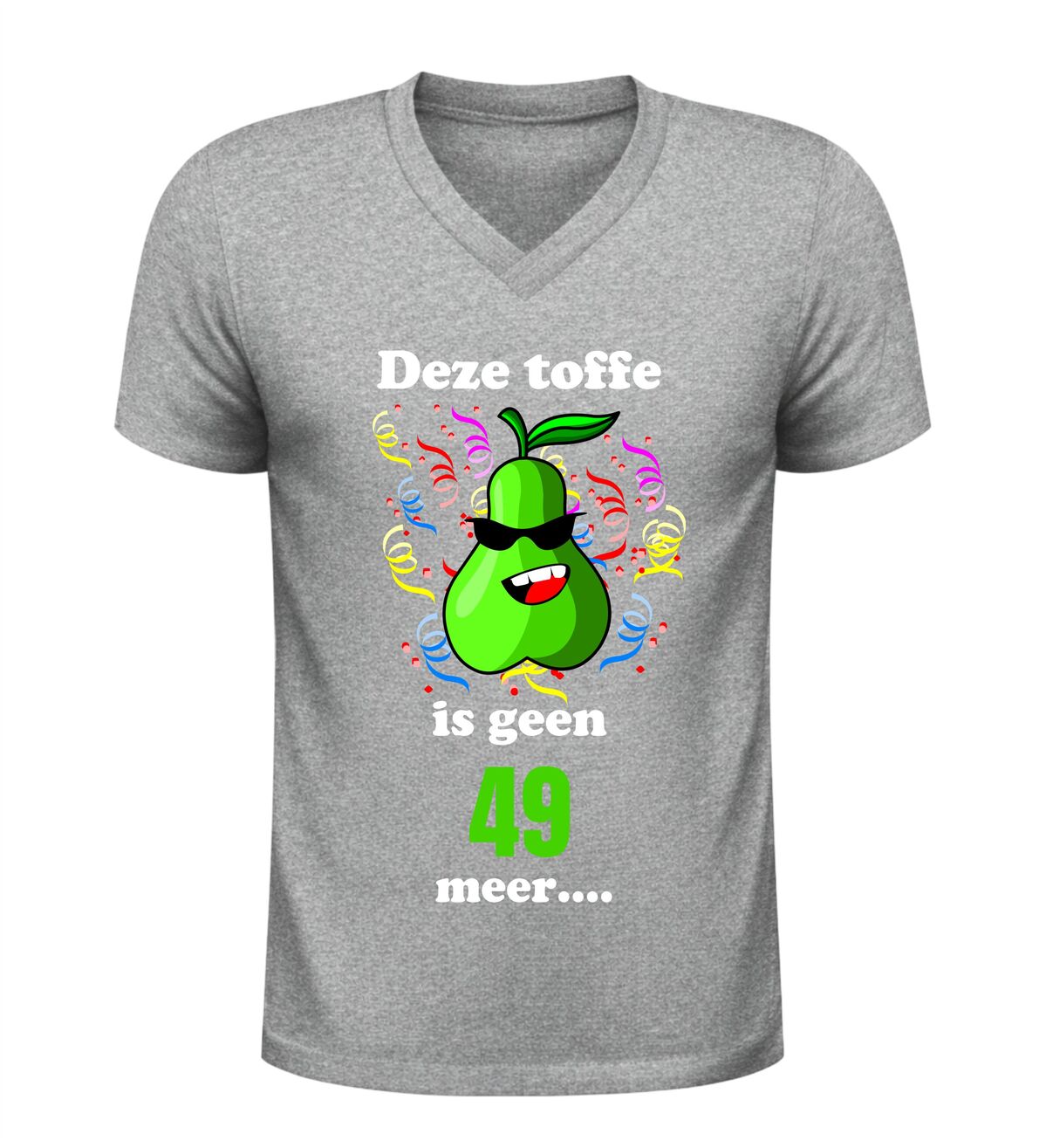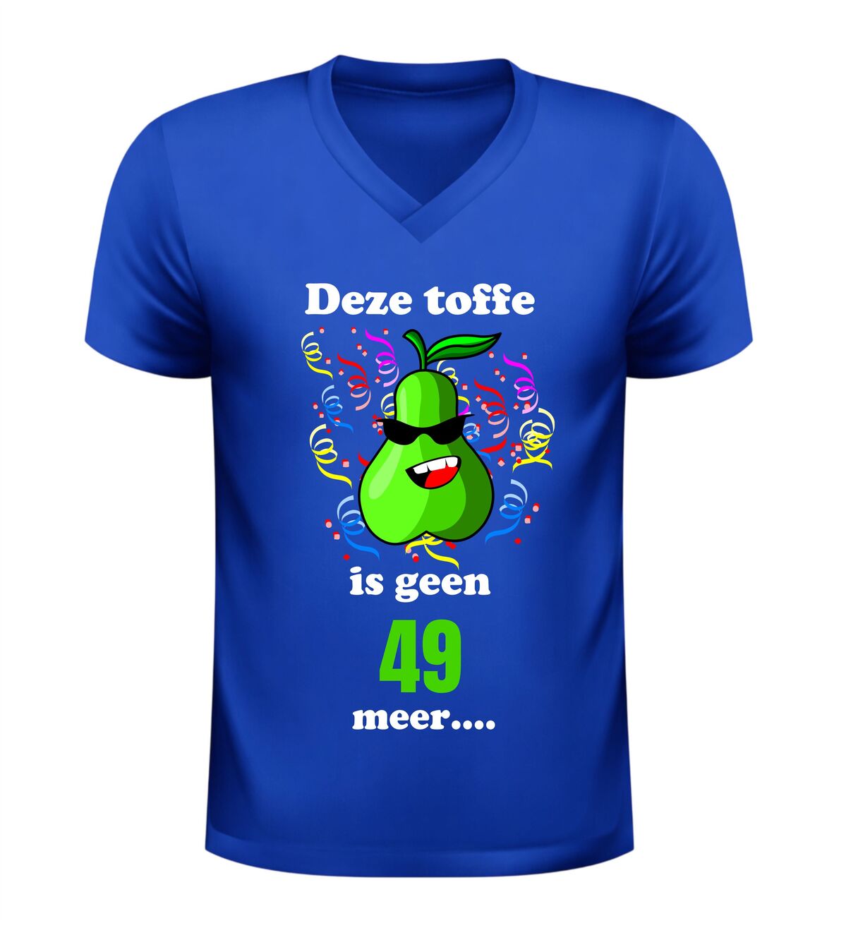 Deze toffe peer is officieel geen 49 meer en dat mag gezien worden. Dit grappige V-hals shirt met de tekst: Deze toffe peer is geen 49 meer en de vrolijke peer met zonnebril is hét perfecte verjaardagsshirt voor iemand die 50 jaar wordt en daar met humor mee omgaat. De comfortabele V-hals zorgt voor een fijne pasvorm en maakt dit shirt ideaal om te dragen tijdens het verjaardagsfeest, een etentje of gewoon om iedereen te laten weten dat 50 het nieuwe cool is. Dit T-shirt is een origineel cadeau voor mannen of vrouwen die hun mijlpaal vieren met een knipoog en zich nog steeds een echte toffe peer voelen. Een leuk, opvallend en grappig verjaardagsshirt waarmee de jarige gegarandeerd in het middelpunt van de aandacht staat.