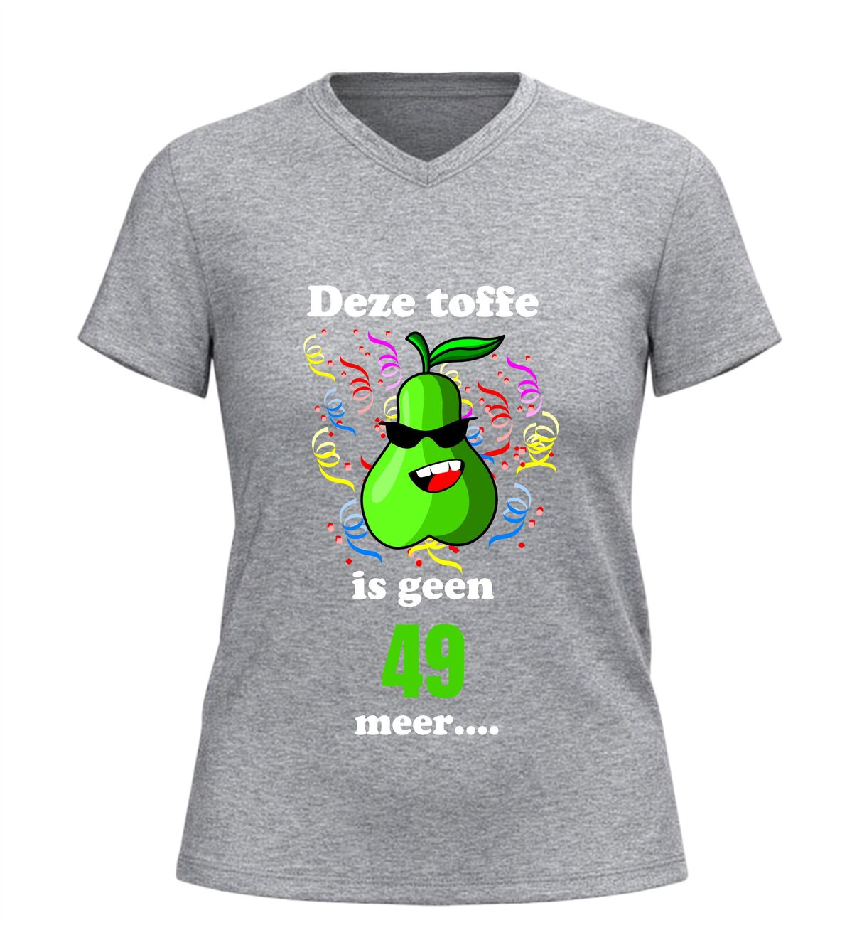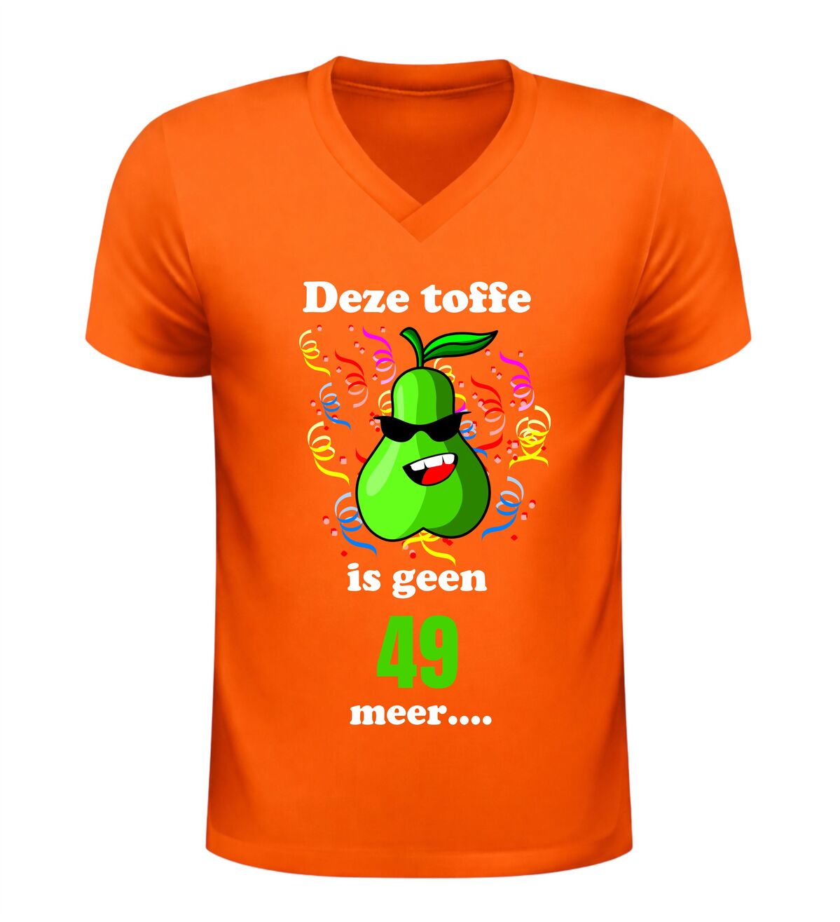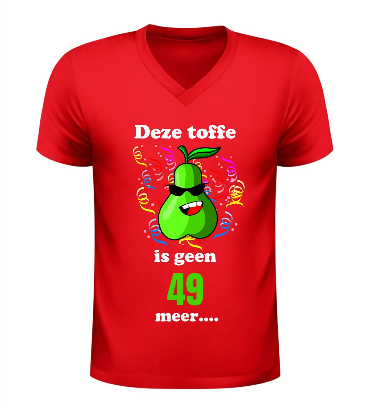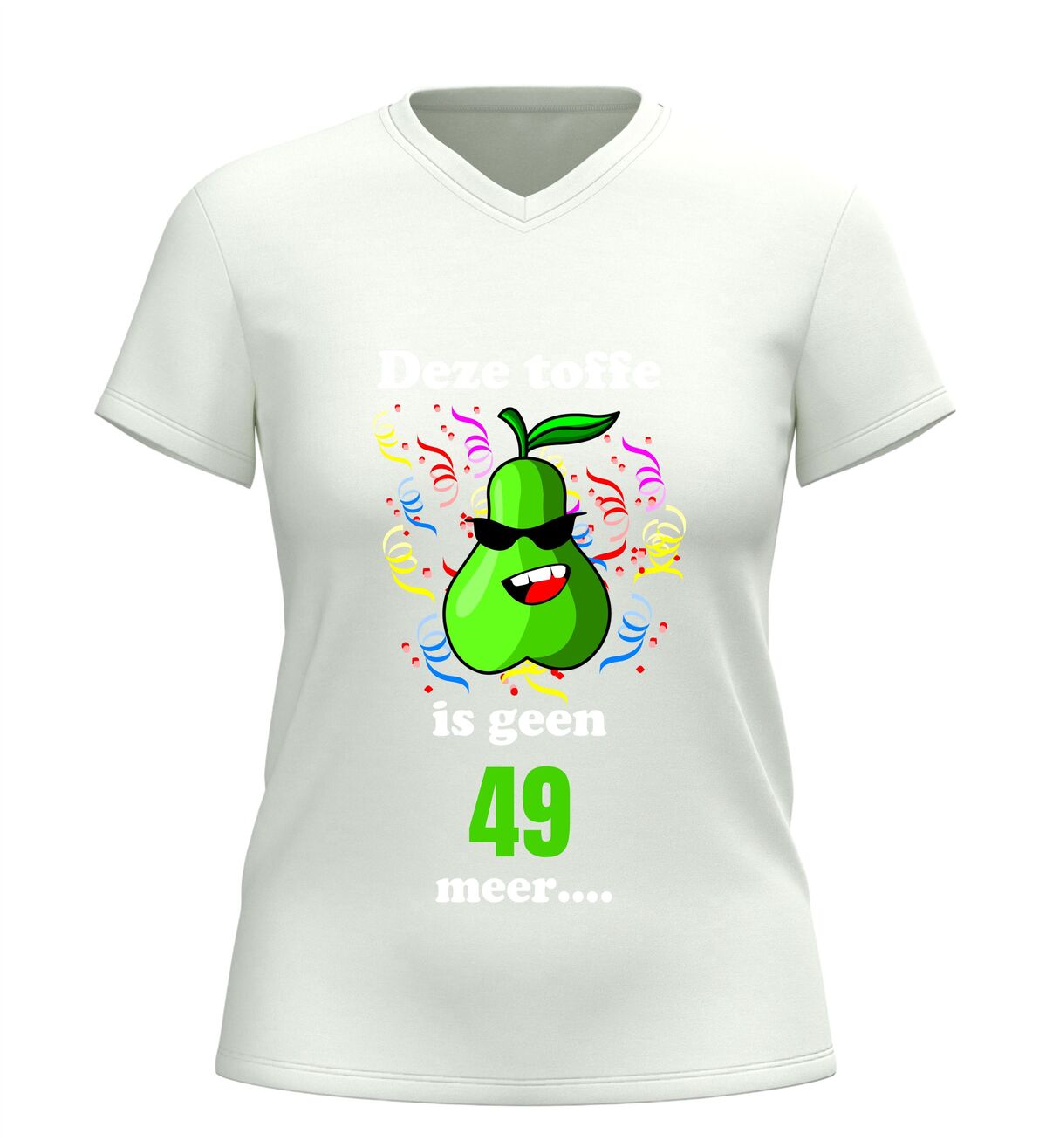 Deze toffe peer is officieel geen 49 meer en dat mag gezien worden. Dit grappige V-hals shirt met de tekst: Deze toffe peer is geen 49 meer en de vrolijke peer met zonnebril is hét perfecte verjaardagsshirt voor iemand die 50 jaar wordt en daar met humor mee omgaat. De comfortabele V-hals zorgt voor een fijne pasvorm en maakt dit shirt ideaal om te dragen tijdens het verjaardagsfeest, een etentje of gewoon om iedereen te laten weten dat 50 het nieuwe cool is. Dit T-shirt is een origineel cadeau voor mannen of vrouwen die hun mijlpaal vieren met een knipoog en zich nog steeds een echte toffe peer voelen. Een leuk, opvallend en grappig verjaardagsshirt waarmee de jarige gegarandeerd in het middelpunt van de aandacht staat.