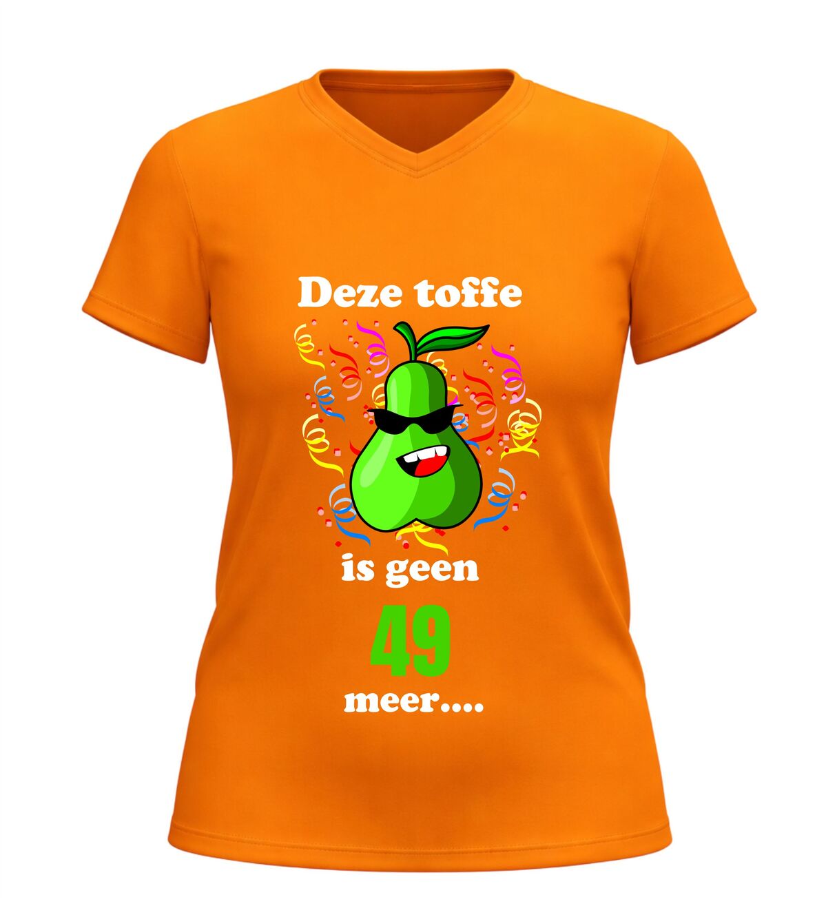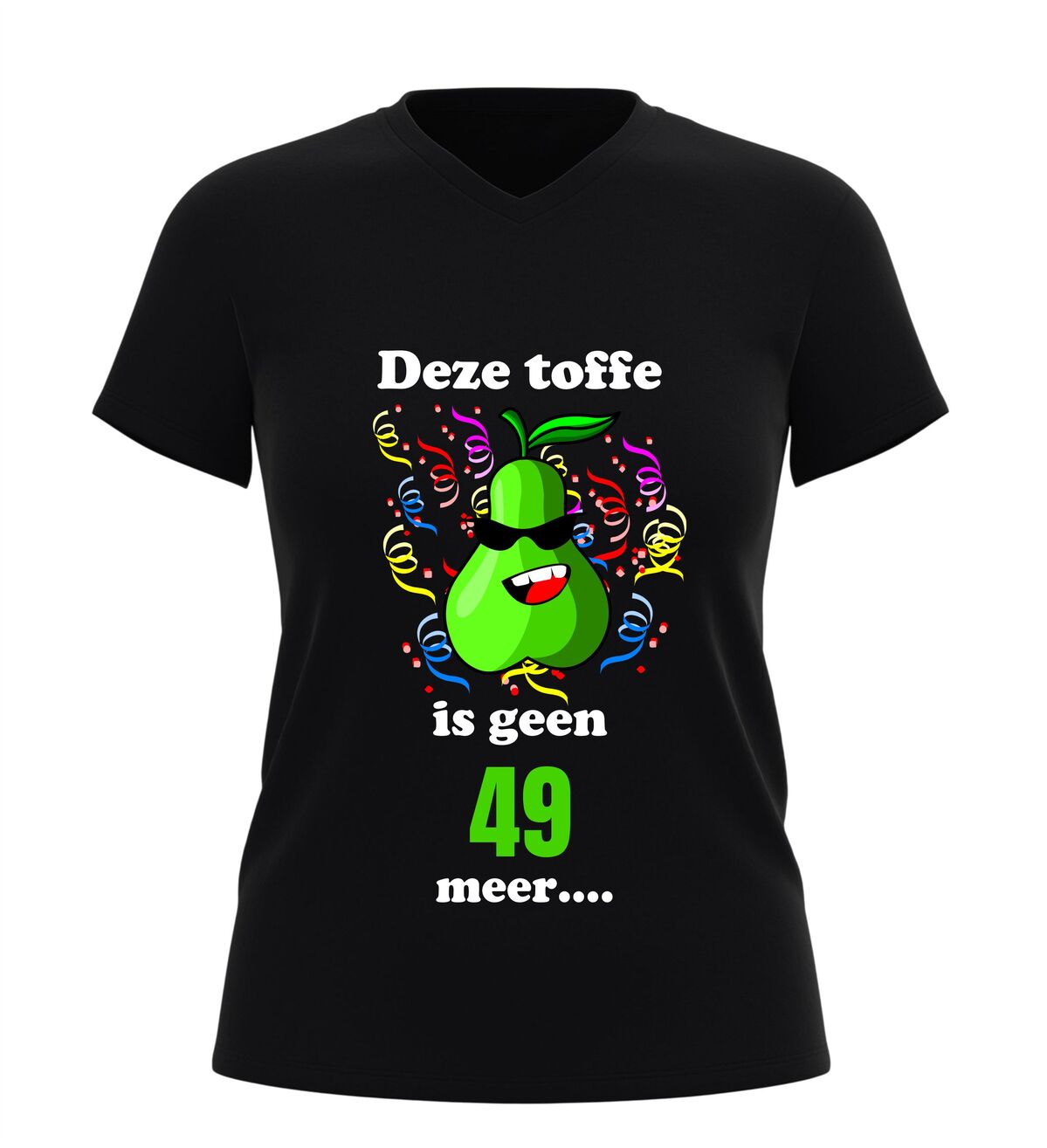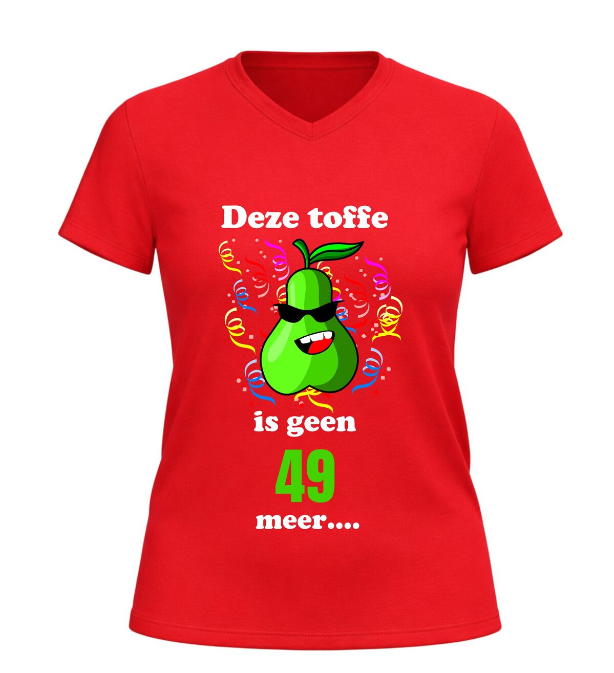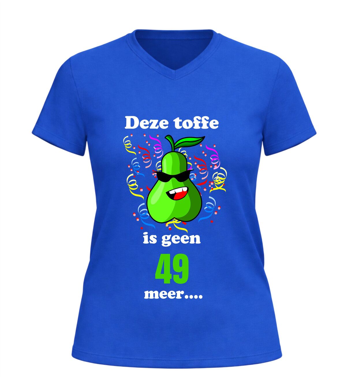 Deze toffe peer is officieel geen 49 meer en dat mag gezien worden. Dit grappige V-hals shirt met de tekst: Deze toffe peer is geen 49 meer en de vrolijke peer met zonnebril is hét perfecte verjaardagsshirt voor iemand die 50 jaar wordt en daar met humor mee omgaat. De comfortabele V-hals zorgt voor een fijne pasvorm en maakt dit shirt ideaal om te dragen tijdens het verjaardagsfeest, een etentje of gewoon om iedereen te laten weten dat 50 het nieuwe cool is. Dit T-shirt is een origineel cadeau voor mannen of vrouwen die hun mijlpaal vieren met een knipoog en zich nog steeds een echte toffe peer voelen. Een leuk, opvallend en grappig verjaardagsshirt waarmee de jarige gegarandeerd in het middelpunt van de aandacht staat.