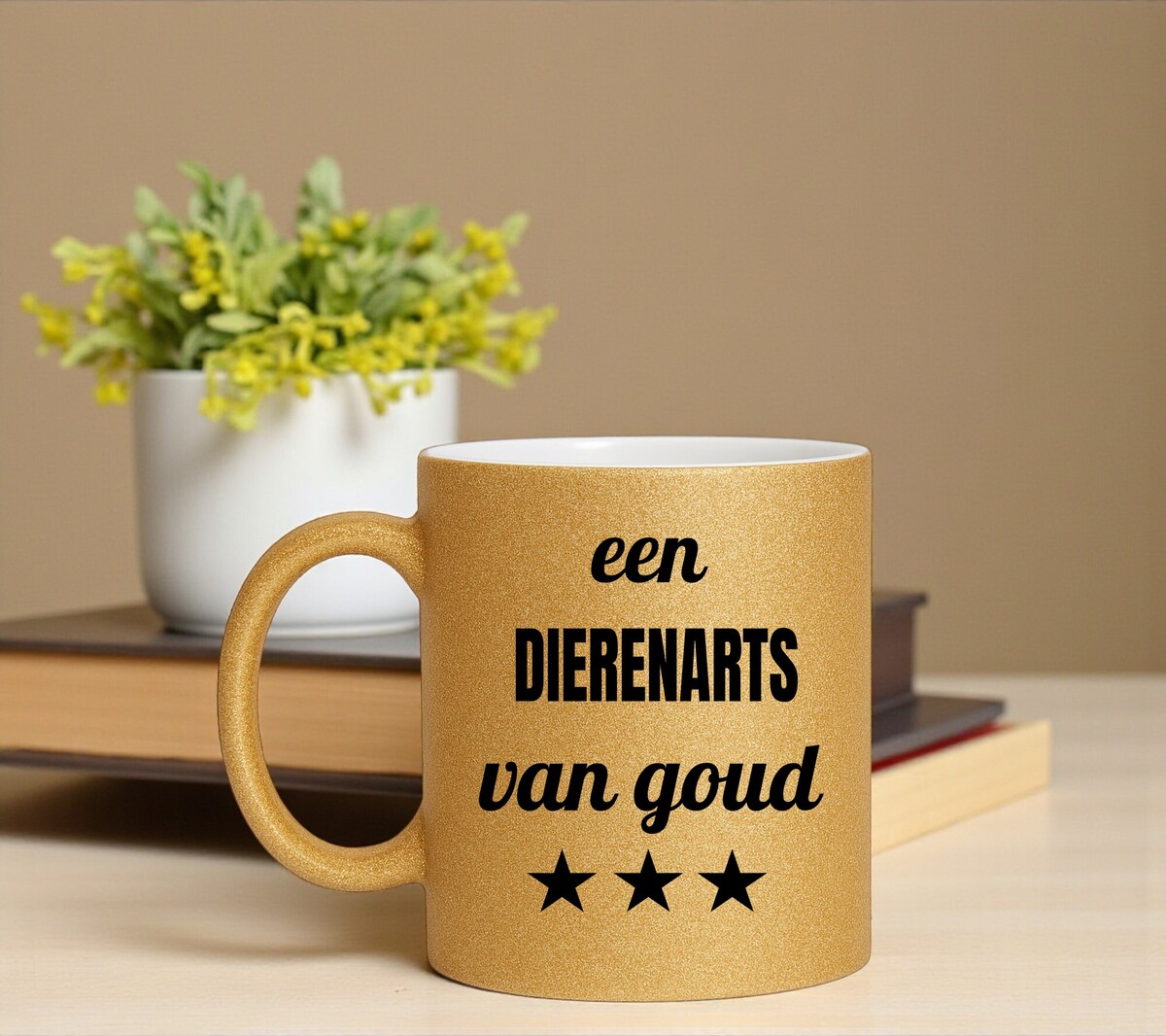 Deze glitter gouden mok is een leuk en orgineel cadeau voor een dierenarts van goud.