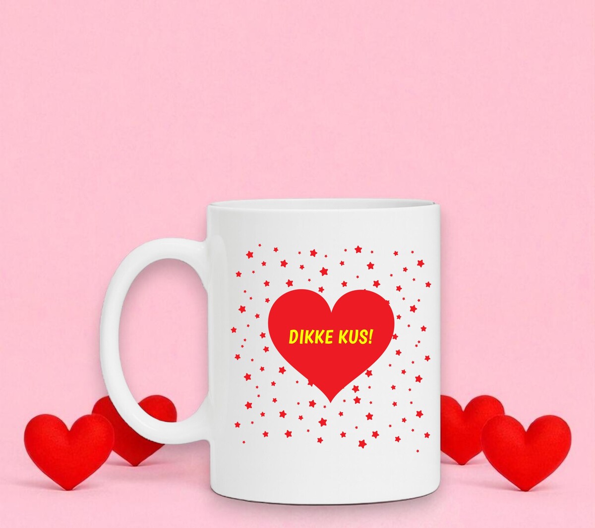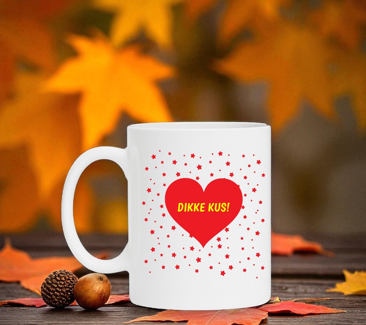 Een superlieve Koffiemok voor bijvoorbeeld Vaderdag, Moederdag, Valentijn of zomaar. Op de koffiemok staat de tekst 'Dikke kus'