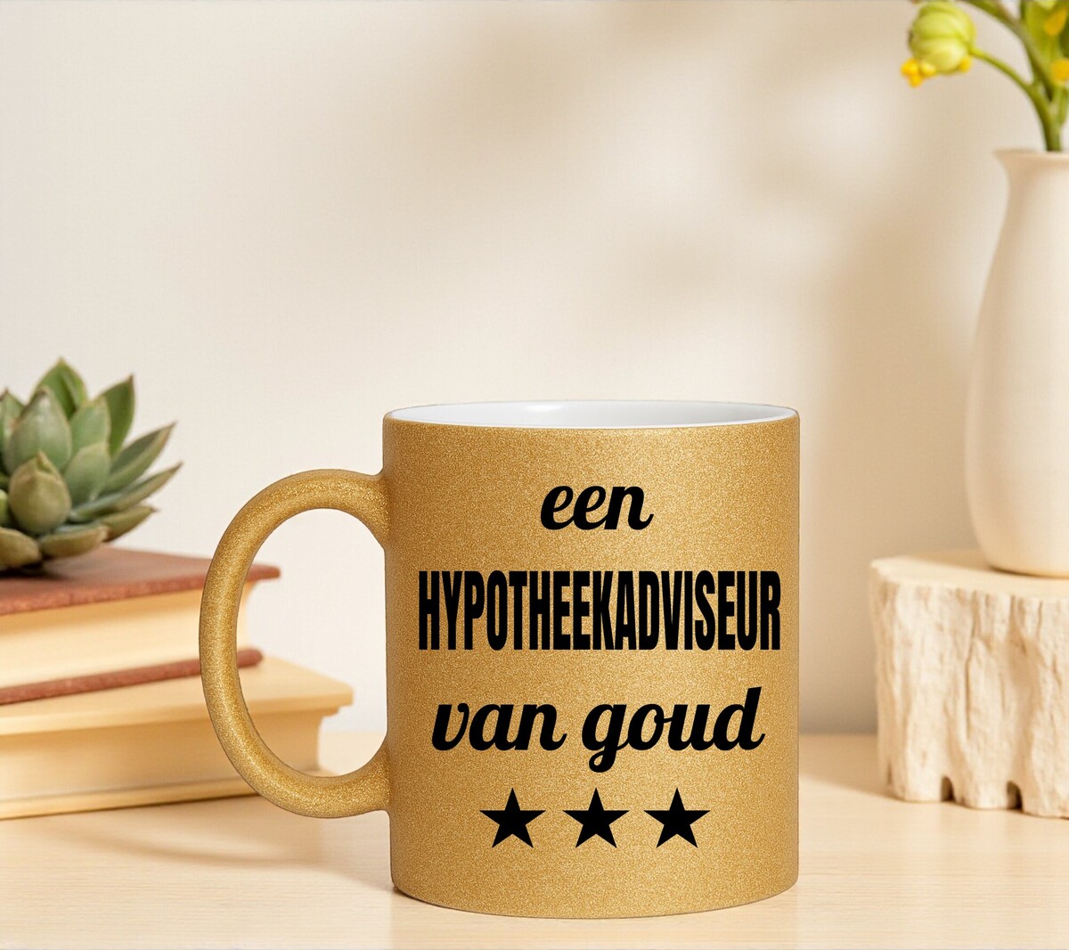 Wil je een hypotheekadviseur bedanken? dat kan met deze mok in het goud voor hypotheekadviseur van goud.