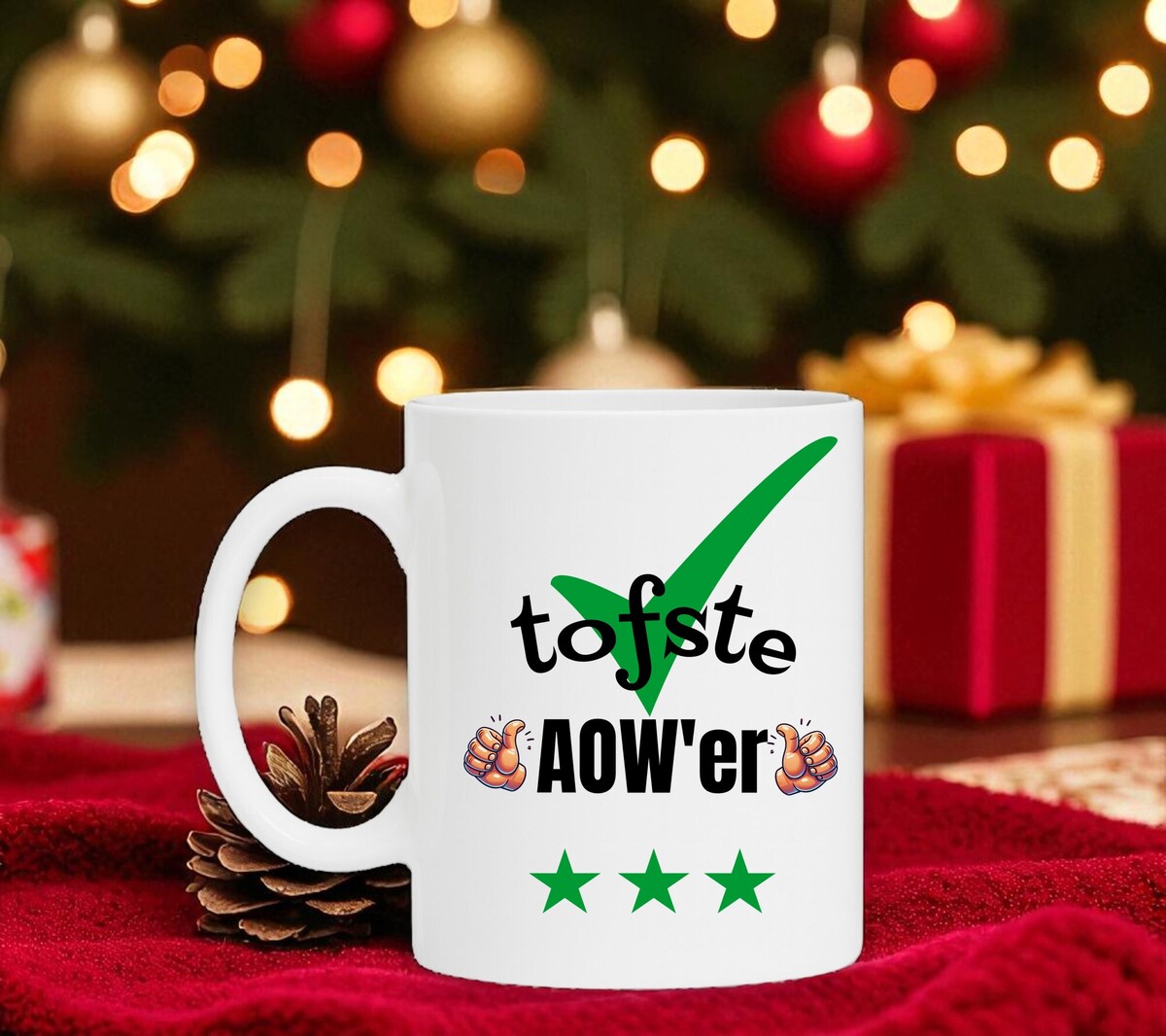 Een leuk kado voor de tofste AOW'er. Leuk om cadeau te geven bij een verjaardag, bedankje of gewoon zomaar. De mok is vaatwasserbestendig en magnetronbestendig en heeft een hoogte van 96mm en een diameter van 80mm.