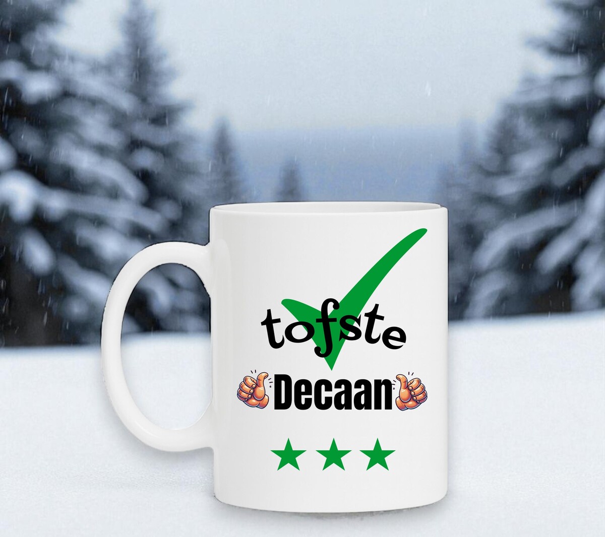 Een leuk kado voor de tofste Decaan. Leuk om cadeau te geven bij een verjaardag, bedankje of gewoon zomaar. De mok is vaatwasserbestendig en magnetronbestendig en heeft een hoogte van 96mm en een diameter van 80mm.