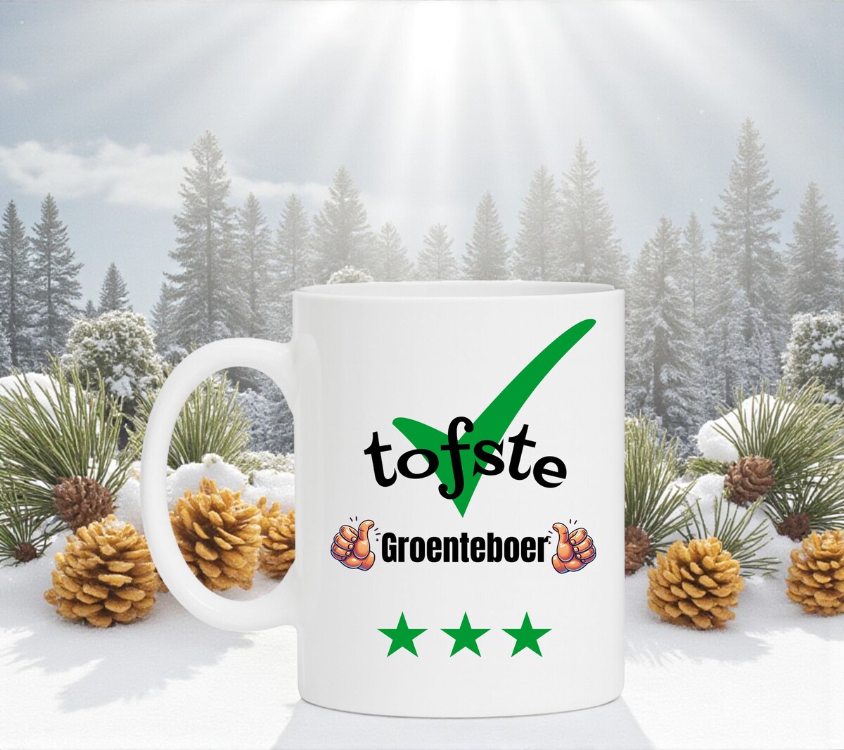 Een leuk kado voor de tofste Groenteboer. Leuk om cadeau te geven bij een verjaardag, bedankje of gewoon zomaar. De mok is vaatwasserbestendig en magnetronbestendig en heeft een hoogte van 96mm en een diameter van 80mm.