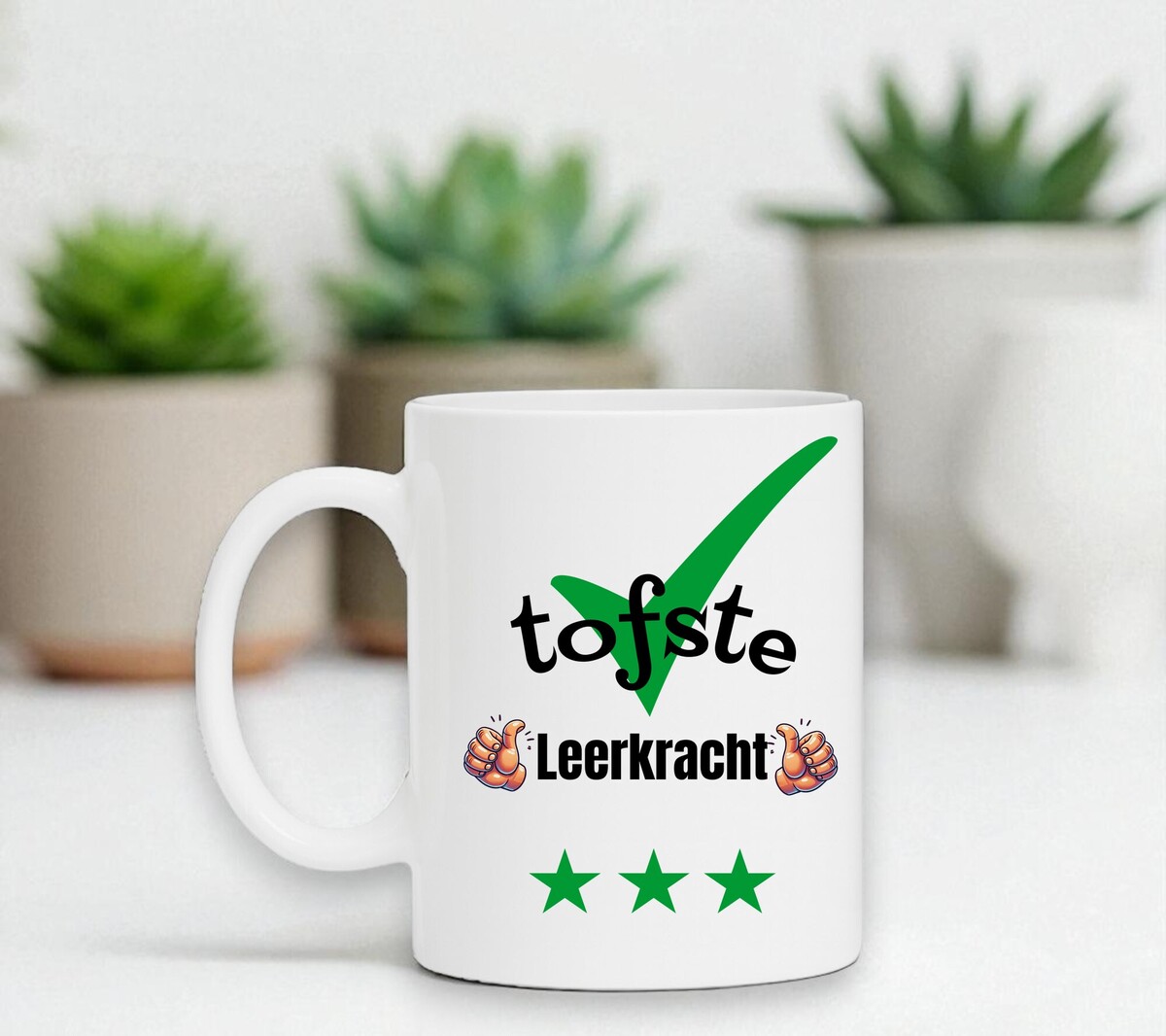 Een leuk kado voor de tofste Leerkracht. Leuk om cadeau te geven bij een verjaardag, bedankje of gewoon zomaar. De mok is vaatwasserbestendig en magnetronbestendig en heeft een hoogte van 96mm en een diameter van 80mm.