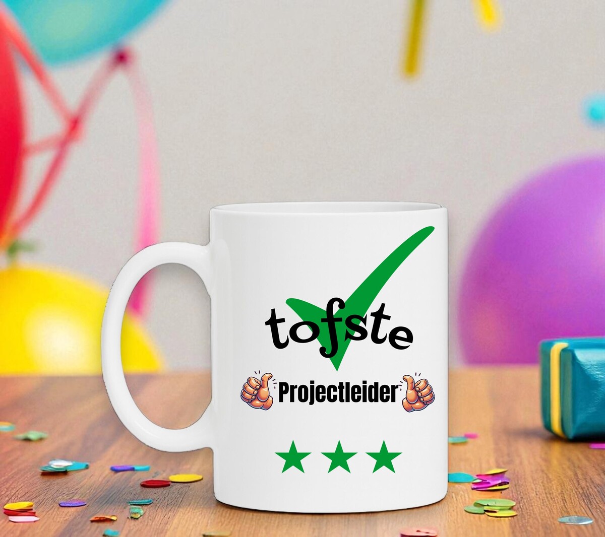 Een leuk kado voor de tofste Projectleider. Leuk om cadeau te geven bij een verjaardag, bedankje of gewoon zomaar. De mok is vaatwasserbestendig en magnetronbestendig en heeft een hoogte van 96mm en een diameter van 80mm.