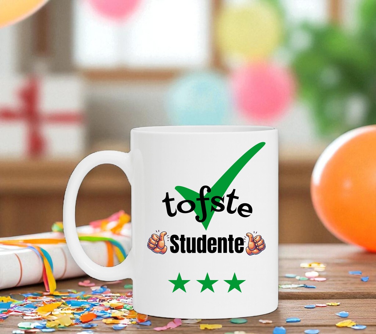 Een leuk kado voor de tofste Studente. Leuk om cadeau te geven bij een verjaardag, bedankje of gewoon zomaar. De mok is vaatwasserbestendig en magnetronbestendig en heeft een hoogte van 96mm en een diameter van 80mm.