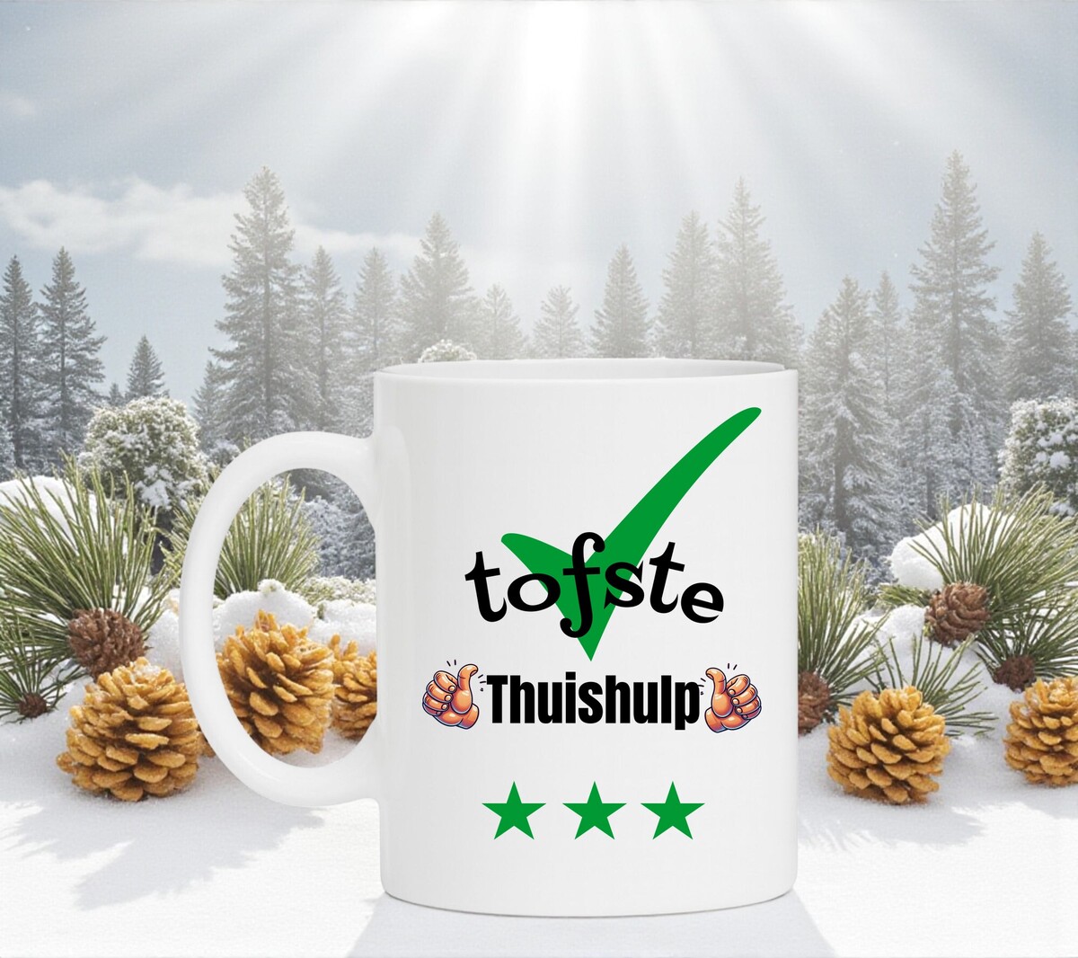 Een leuk kado voor de tofste Thuishulp. Leuk om cadeau te geven bij een verjaardag, bedankje of gewoon zomaar. De mok is vaatwasserbestendig en magnetronbestendig en heeft een hoogte van 96mm en een diameter van 80mm.