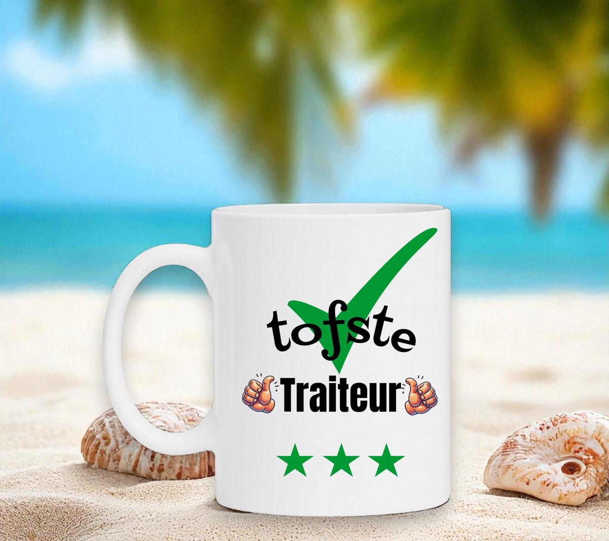 Een leuk kado voor de tofste Traiteur. Leuk om cadeau te geven bij een verjaardag, bedankje of gewoon zomaar. De mok is vaatwasserbestendig en magnetronbestendig en heeft een hoogte van 96mm en een diameter van 80mm.
