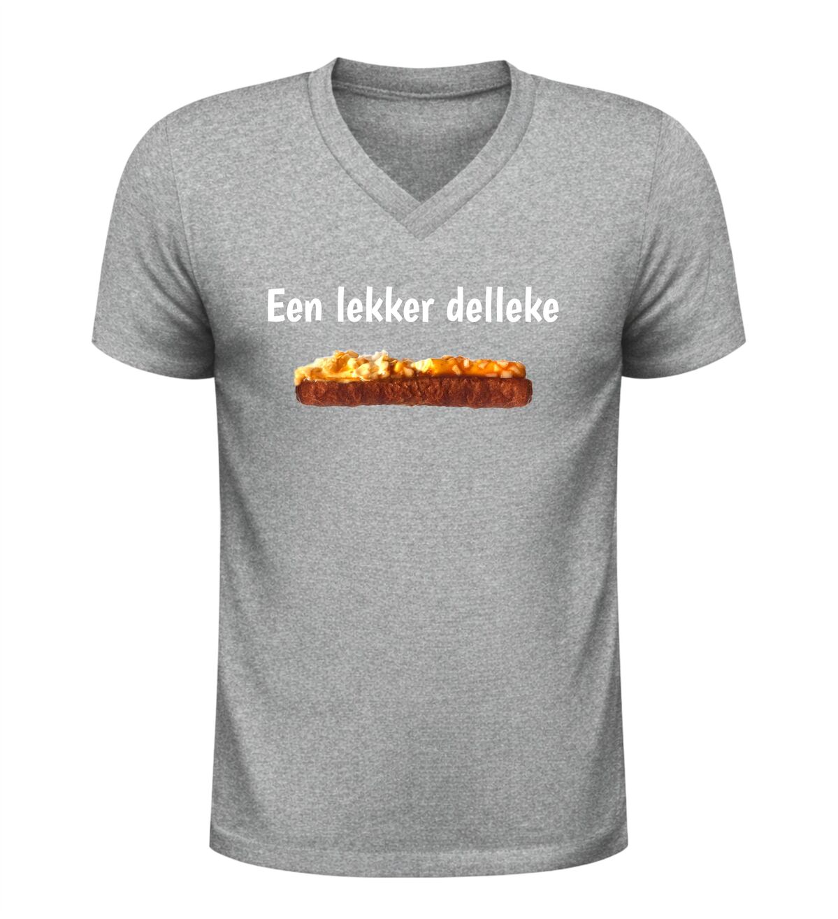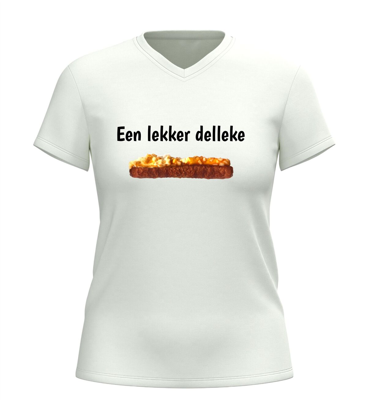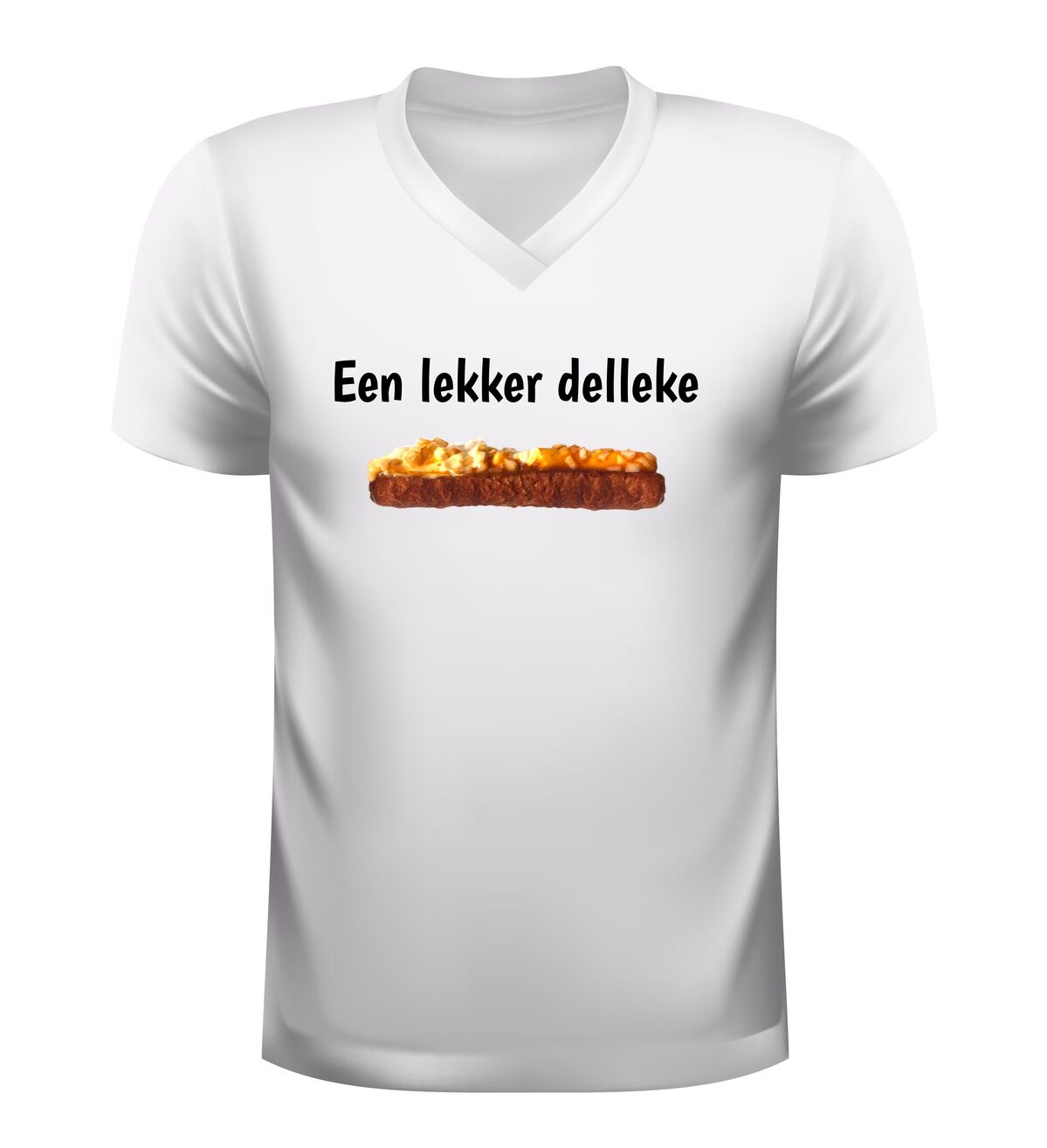 Dit v-hals shirt met de tekst Een lekker delleke en een onweerstaanbare frikandel speciaal is gemaakt voor iedereen die weet dat geluk soms gewoon uit de snackbar komt. Met dit shirt laat je zien dat jij het leven niet te serieus neemt en dat echte Brabantse gezelligheid prima samengaat met een flinke dot mayo, curry en uitjes. Perfect om te dragen op de camping, tijdens carnaval, op een festival of gewoon wanneer je trek hebt in iets lekkers. De comfortabele v-hals zit heerlijk en maakt dit T-shirt ideaal voor lange avonden lachen, borrelen en snacken. Of je nu Brabander bent of gewoon groot fan van de frikandel speciaal, dit shirt zorgt gegarandeerd voor herkenning, humor en trek. Een origineel kledingstuk voor liefhebbers van Brabantse humor, snackcultuur en lekker ongecompliceerd genieten.