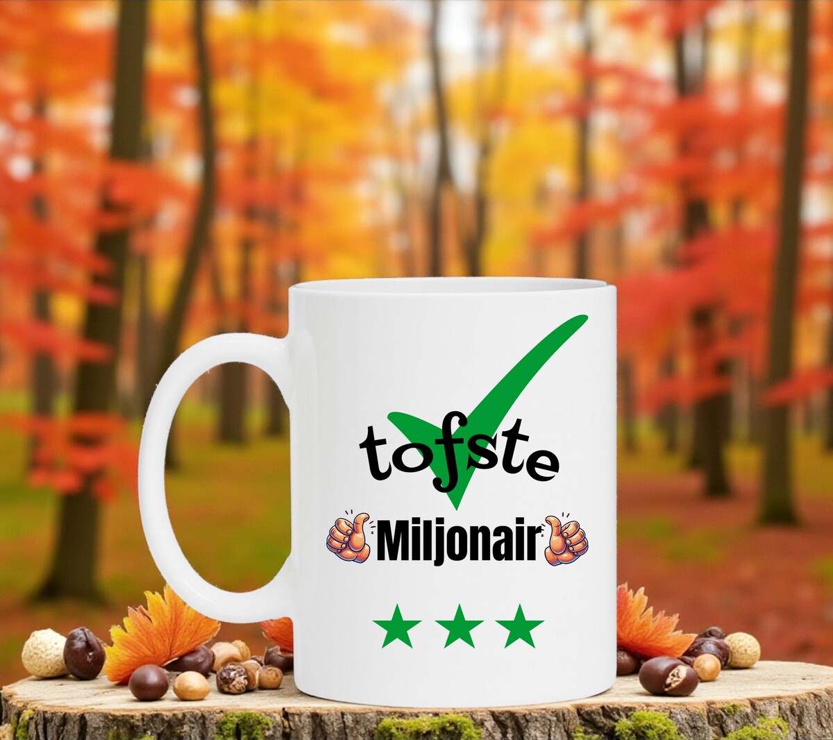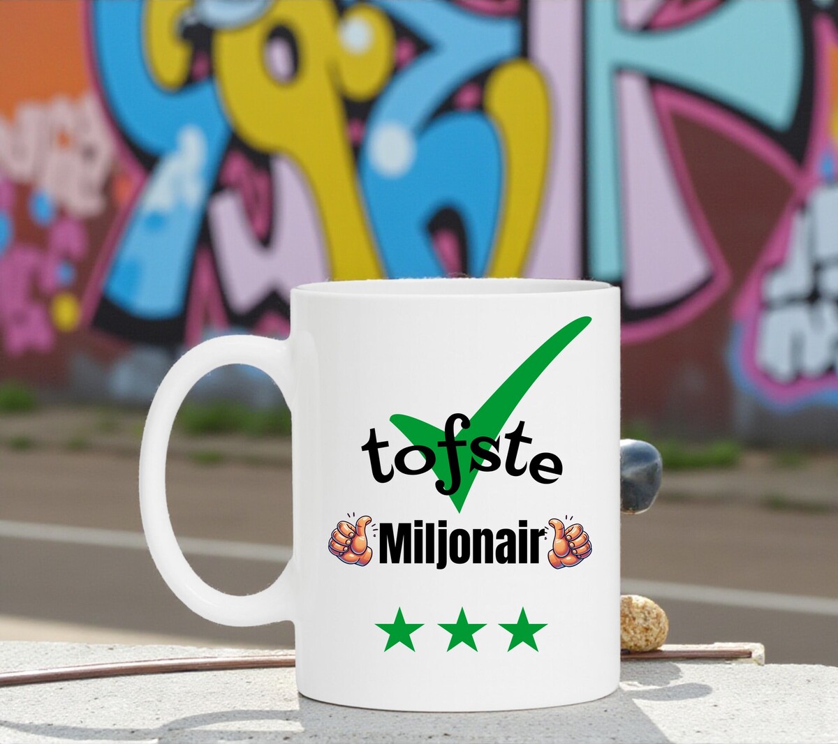 Een prachtig kado voor de tofste Miljonair. Leuk om cadeau te geven en te krijgen, Een tof bedankje of gewoon zomaar een leuk gebaar. De mok is vaatwasserbestendig en magnetronbestendig en heeft een hoogte van 96mm en een diameter van 80mm.
