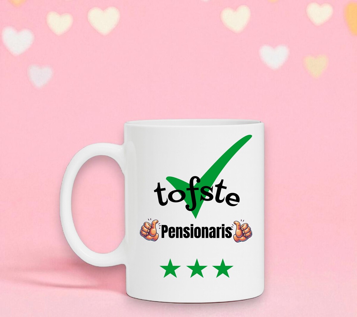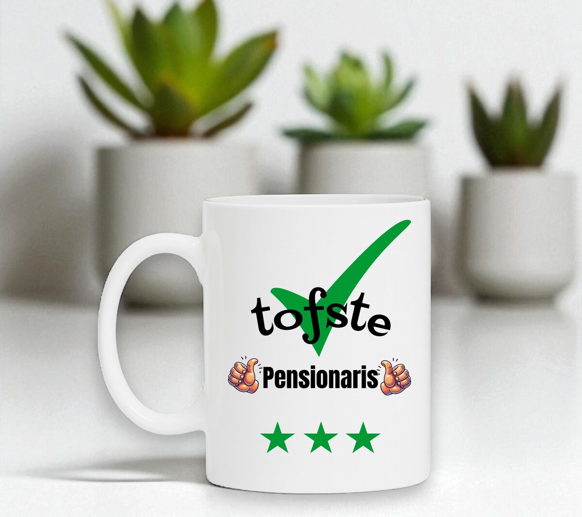 Een prachtig kado voor de tofste Pensionaris. Leuk om cadeau te geven en te krijgen, Een tof bedankje of gewoon zomaar een leuk gebaar. De mok is vaatwasserbestendig en magnetronbestendig en heeft een hoogte van 96mm en een diameter van 80mm.