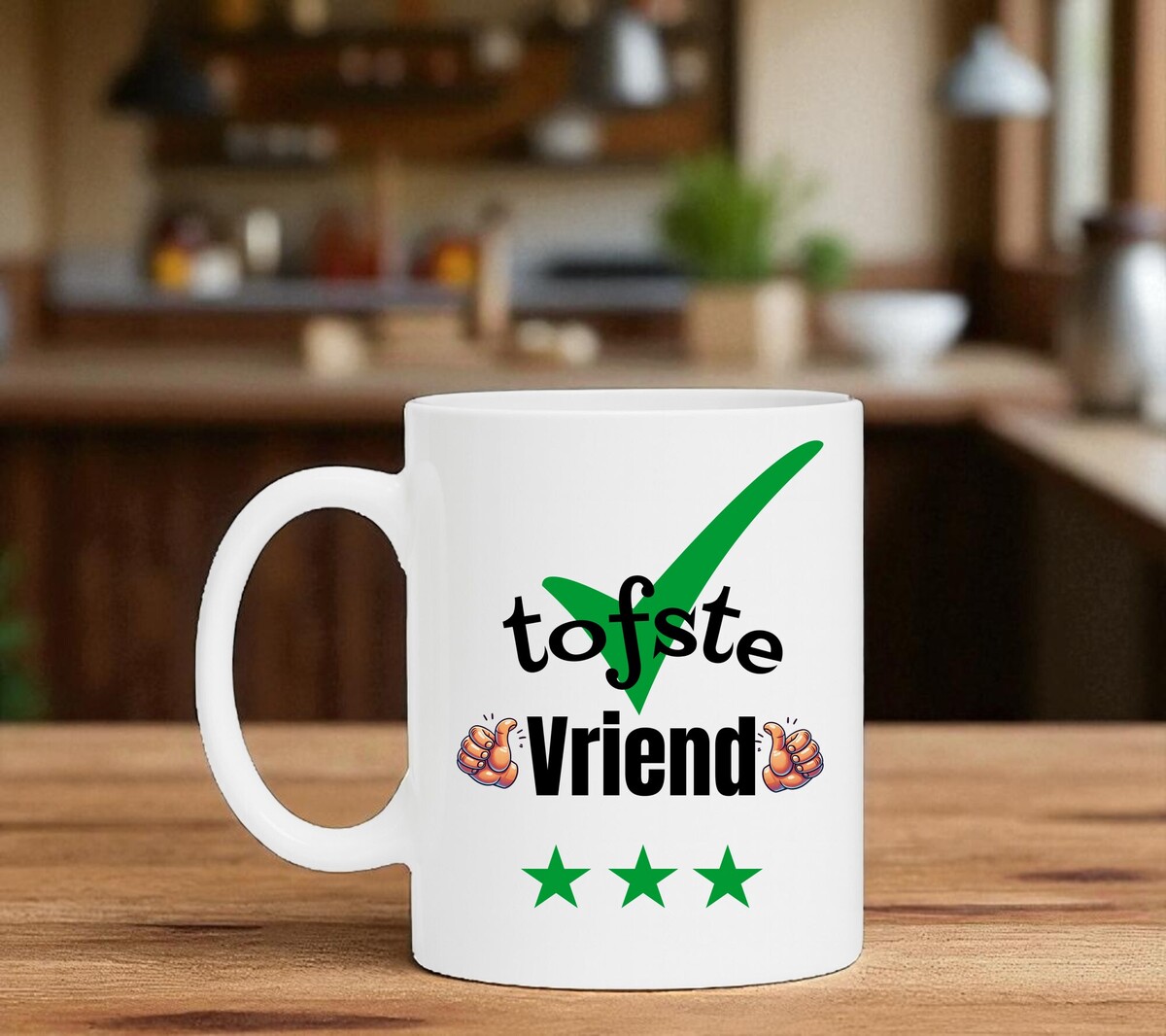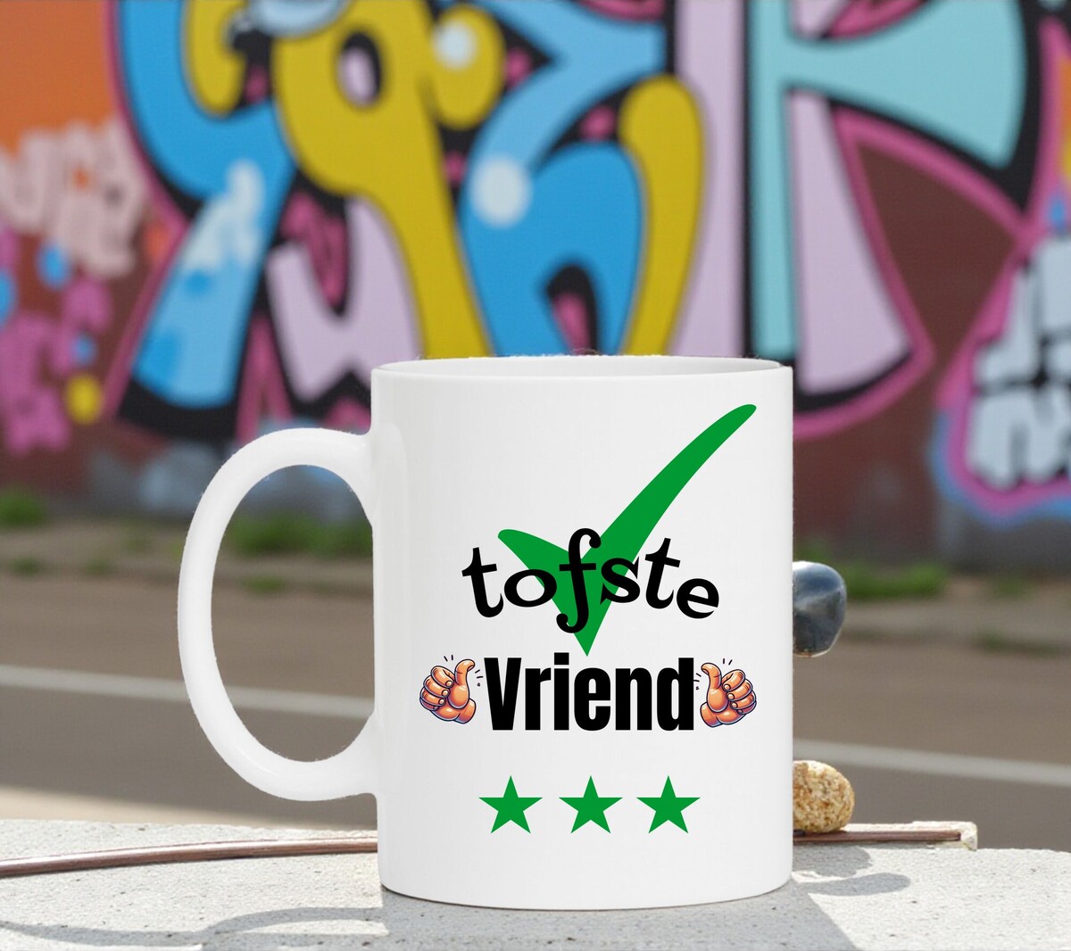 Een prachtig kado voor de tofste Vriend. Leuk om cadeau te geven en te krijgen, Een tof bedankje of gewoon zomaar een leuk gebaar. De mok is vaatwasserbestendig en magnetronbestendig en heeft een hoogte van 96mm en een diameter van 80mm.