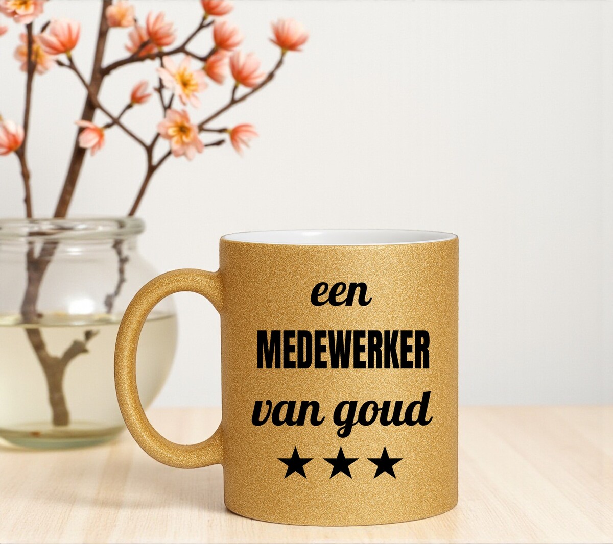 Wil jij je medewerker een bedankje geven voor zijn goede prestatie? dan is deze glitter gouden mok voor een medewerker van goud een leuke cadeautip.