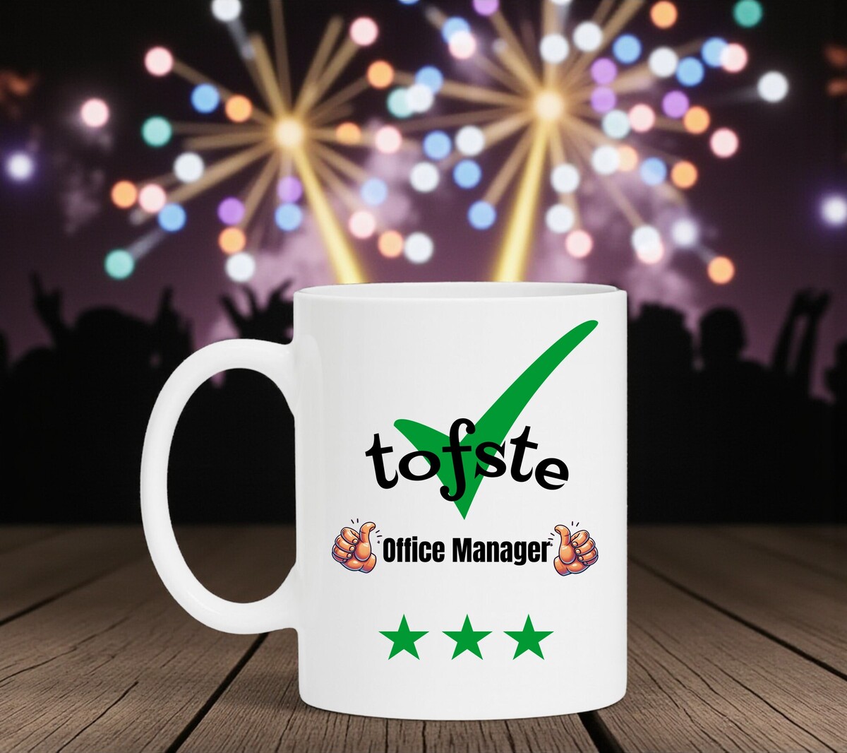 Een prachtig kado voor de tofste Office Manager. Erg Leuk om de mok cadeau te geven. Een tof bedankje of gewoon zomaar een leuk gebaar. De mok is vaatwasserbestendig en magnetronbestendig en heeft een hoogte van 96mm en een diameter van 80mm.