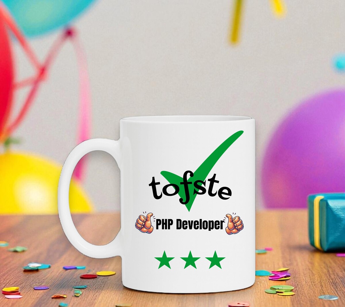Een prachtig kado voor de tofste PHP Developer. Erg Leuk om de mok cadeau te geven. Een tof bedankje of gewoon zomaar een leuk gebaar. De mok is vaatwasserbestendig en magnetronbestendig en heeft een hoogte van 96mm en een diameter van 80mm.