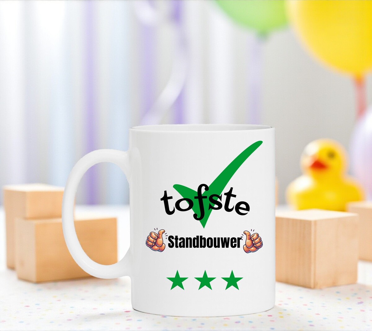 Een prachtig kado voor de tofste Standbouwer. Erg Leuk om de mok cadeau te geven. Een tof bedankje of gewoon zomaar een leuk gebaar. De mok is vaatwasserbestendig en magnetronbestendig en heeft een hoogte van 96mm en een diameter van 80mm.