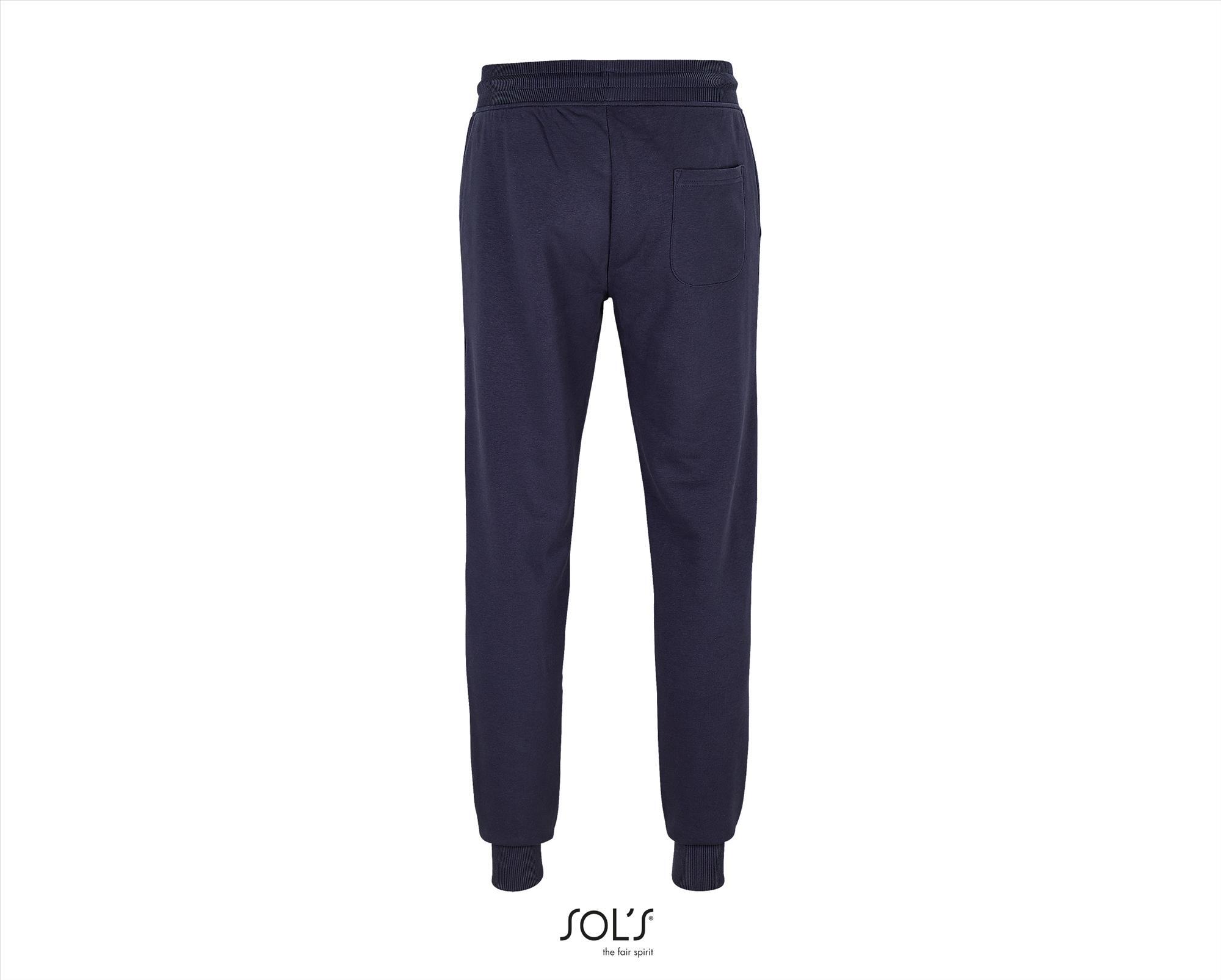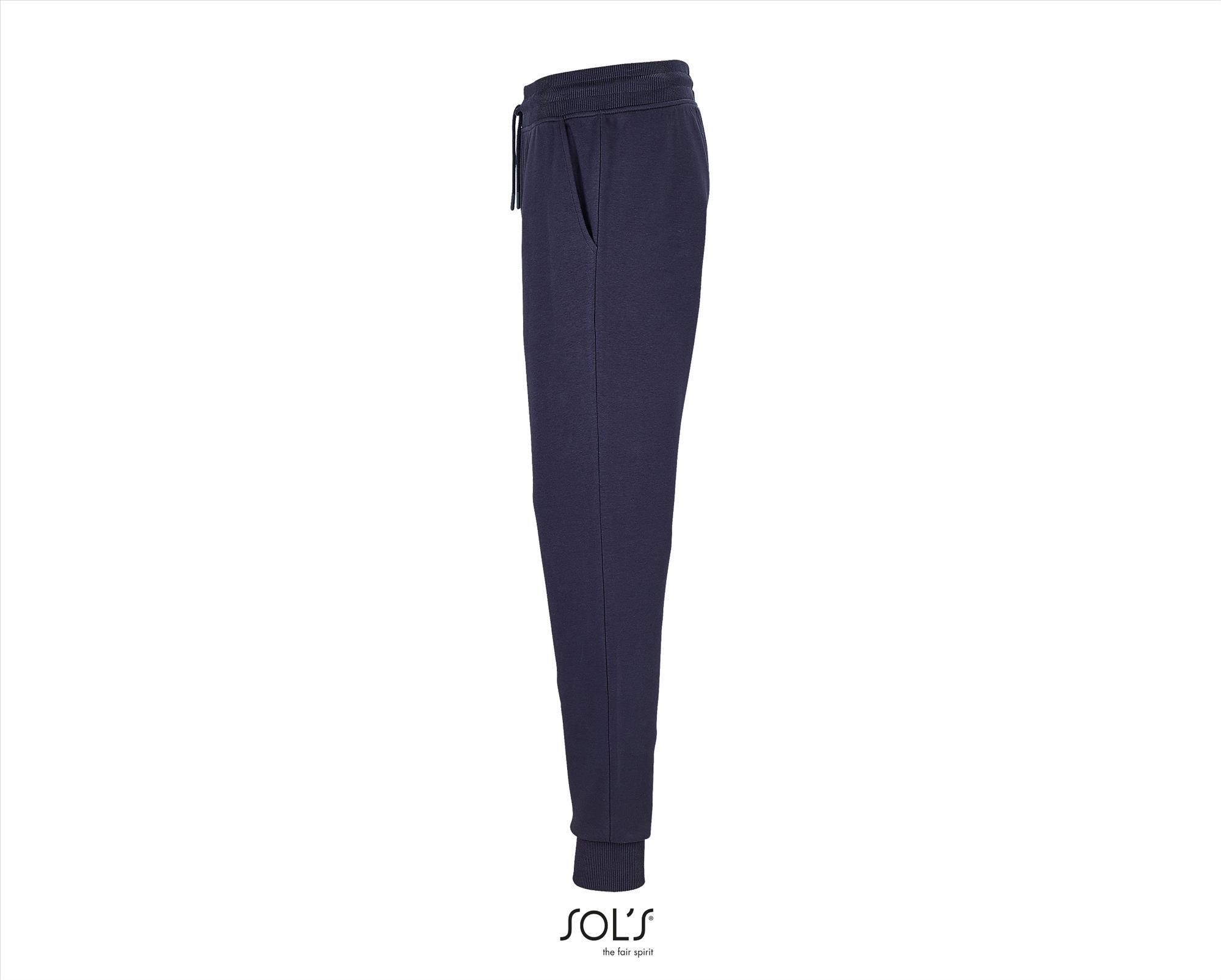 Een trendy unisex joggingbroek donkerblauw. Merk: SOL'S Jumbo. Een trendy unisex joggingbroek gemaakt van organisch katoen en gerecycled polyester. Materiaal:80% Combed Organic Cotton in Conversion - 20%. Dikte:280 g/m2. Foto met model erop is een sfeer foto kleur buiten beschouwing houden. Land van herkomst:Bangladesh.