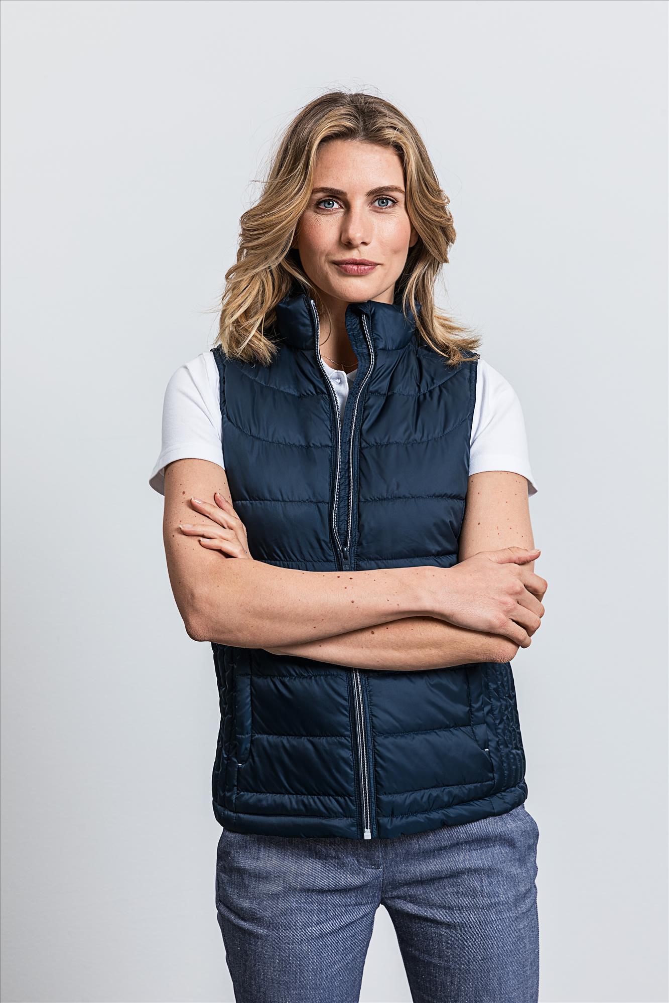 Elegante Russell Nano Dames Bodywarmer dark olive. Trotseer de elementen in stijl met onze Russell Ladies Nano Bodywarmer, een symbool van verfijnde mode gecombineerd met praktische functionaliteit. Deze sierlijke dames bodywarmer is vervaardigd uit superieure DWR-stof, waardoor het water moeiteloos afparelt bij lichte regen. Het eigentijdse ontwerp benadrukt contrasterende ritsen, voering en details, die een stijlvol contrast bieden en je dagelijkse outfit een modieuze upgrade geven. Met twee handige zijzakken en een veilige binnenzak, alle voorzien van ritsen, biedt deze bodywarmer voldoende opbergruimte. Perfect te combineren met zowel een casual polo als een warme trui, en ontworpen om bescherming te bieden tegen wind en regen, terwijl het ademend vermogen behouden blijft. Materiaal:100% Polyester. Land van herkomst:China. De foto van het model dient ter illustratie van de sfeer. Gelieve geen aandacht te besteden aan de kleur.