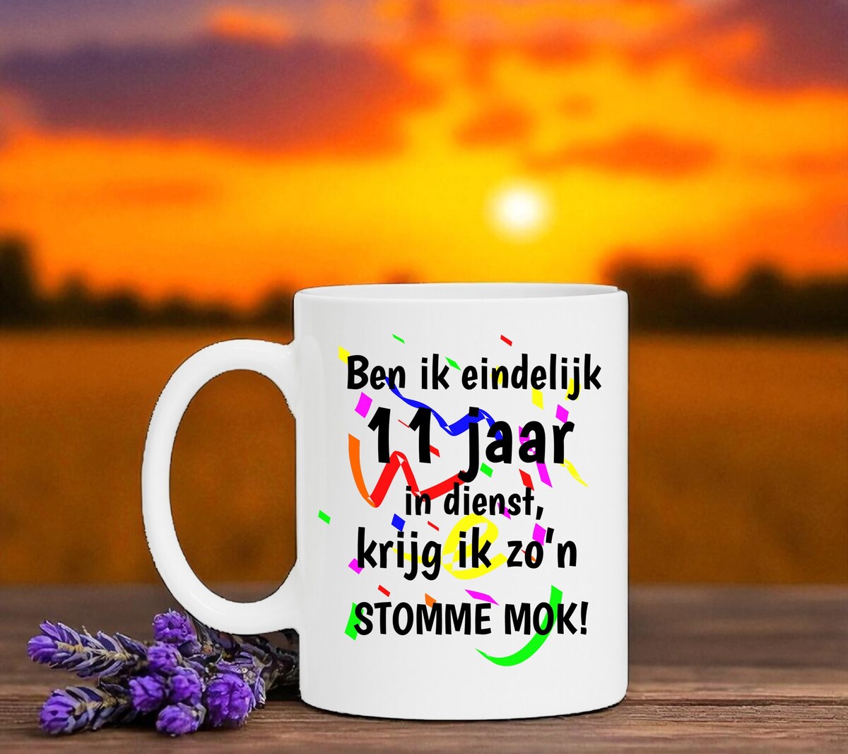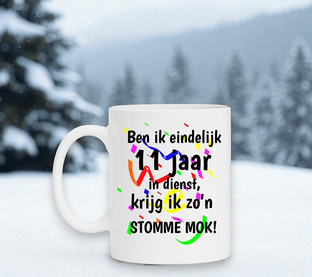 Leuke feestelijke full colour mok met de tekst: Ben ik eindelijk 11 jaar in dienst krijg ik zo'n stomme mok.