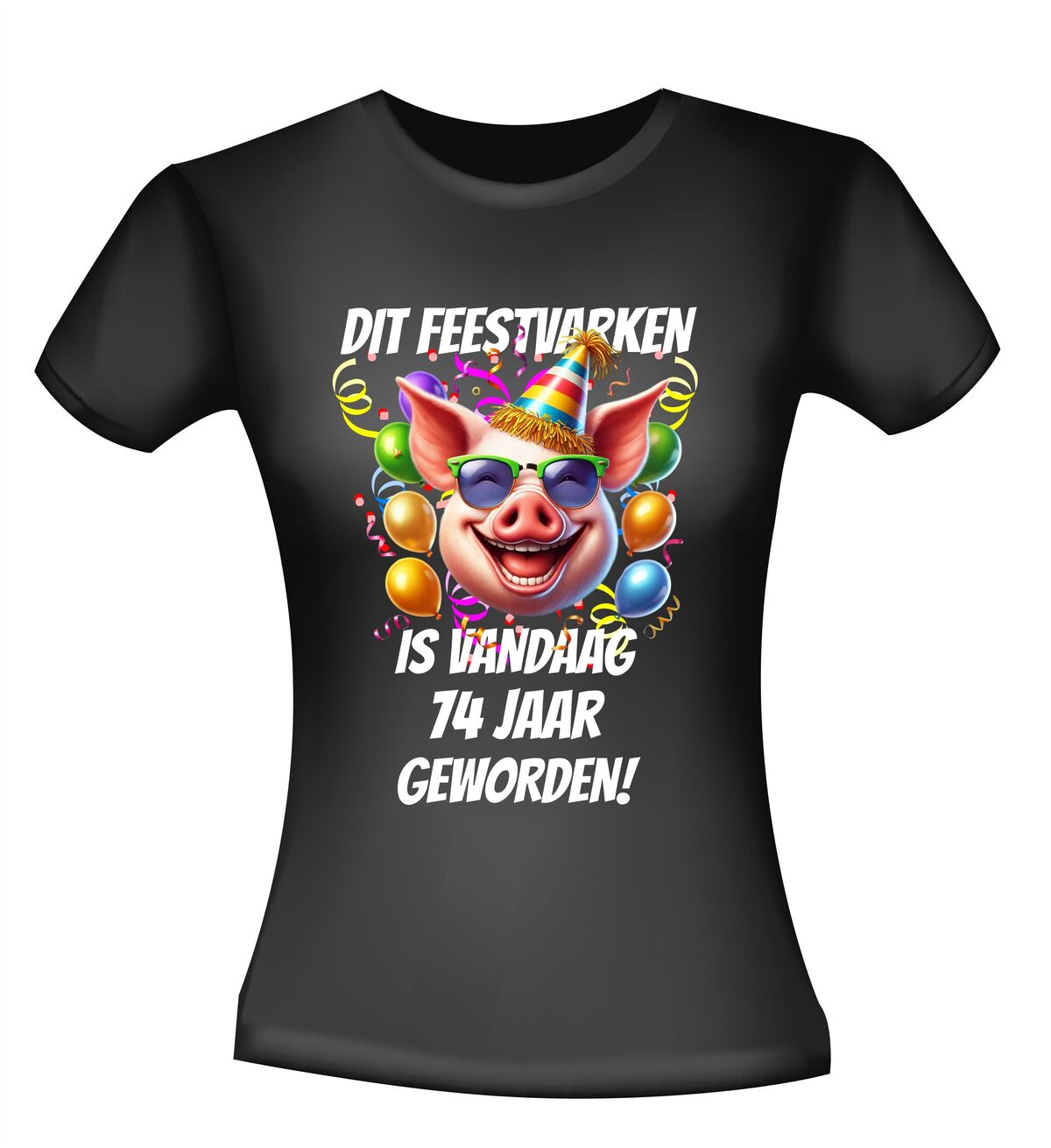 Leuk fun shirt om cadeau te doen wanneer iemand zijn verjaardag van 74 jaar oud viert. Op dit orginele en kleurrijke leeftijd shirt staat de tekst: Dit feestvarken is vandaag 74 jaar geworden.
