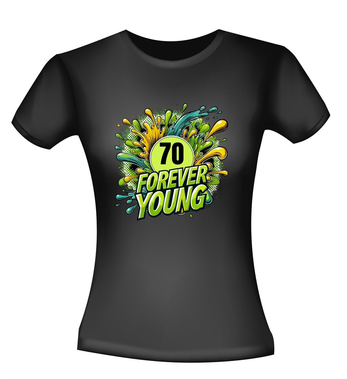 Zoek je een leuk verjaardags cadeau voor iemand die 70 jaar oud wordt. Waarom dan niet dit leuke fun t-shirt met de tekst zeventig en forever young. Op zoek na andere leeftijd shirts kijk gerust eens verder op onze online fun en feestwinkel, want voor elke leeftijd hebben we bijna wel een shirt uit voorraad leverbaar. voor zowel dames als heren.