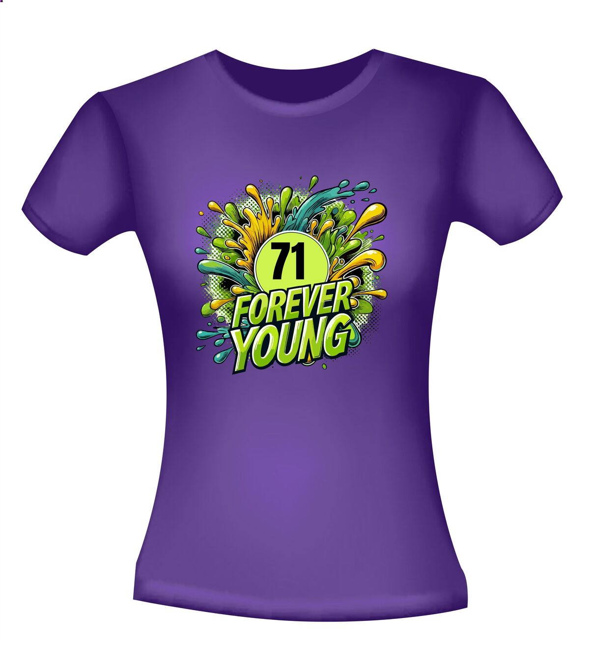 Forever young t-shirt. Dit leeftijd shirt met korte mouw is een leuk verjaardags cadeau voor iemand die 71 jaar wordt. Wie wil er nu niet voor altijd jong blijven. Dit shirt is zowel voor dames als heren uit voorraad leverbaar.