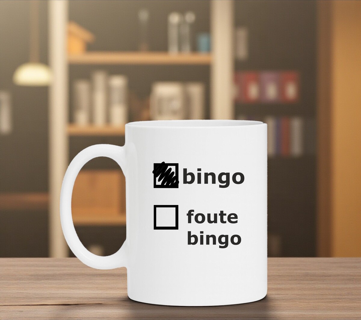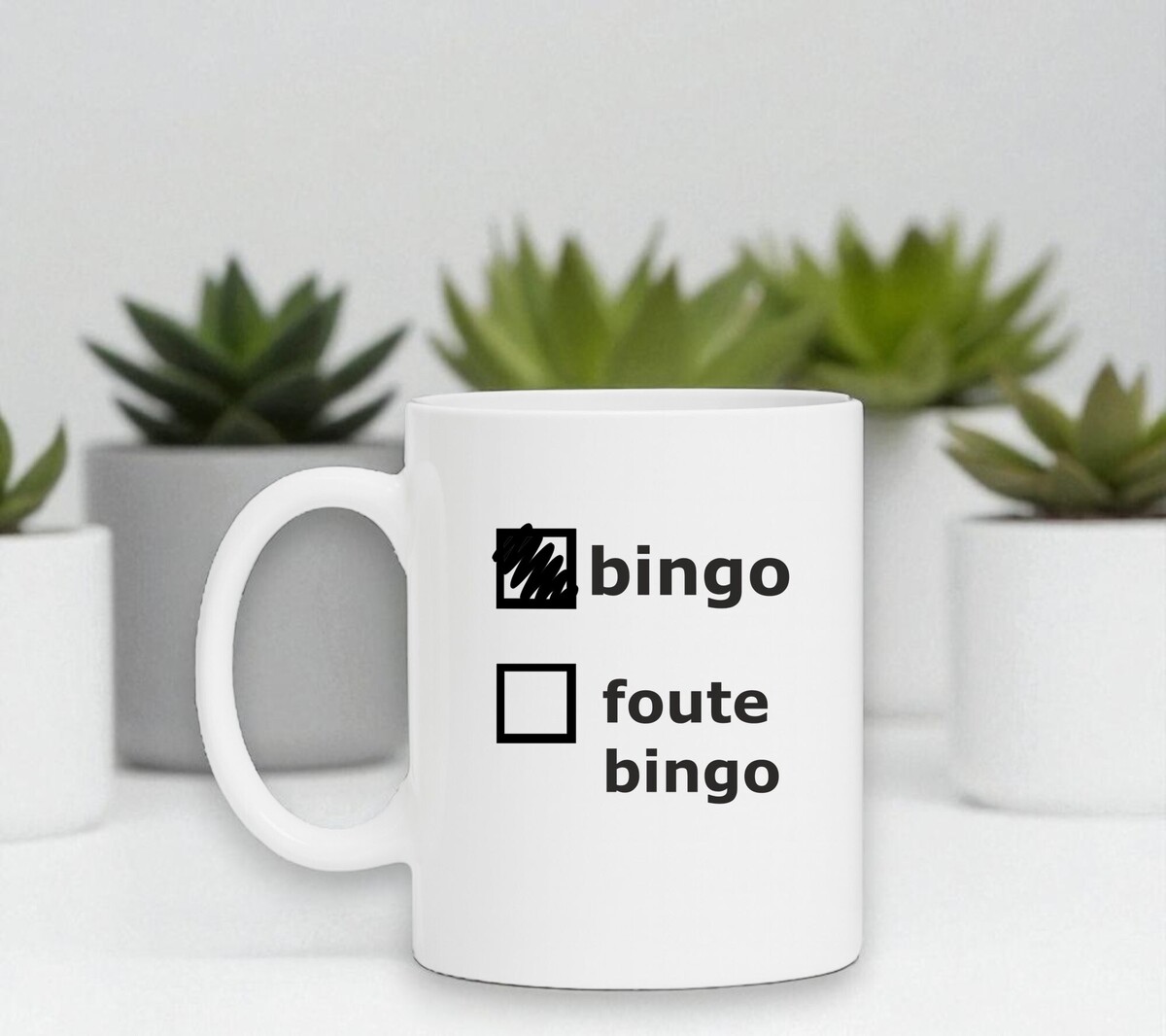 Deze witte Foute Bingo mok is strak, speels en heerlijk over-the-top – precies zoals een echte bingoavond hoort te zijn. Bedrukt met de tekst “Foute Bingo” en voorzien van het woord BINGO! dat groots en aangevinkt op de mok pronkt, laat hij maar één ding duidelijk zien: jij speelt niet mee om te kijken… jij speelt om te winnen.