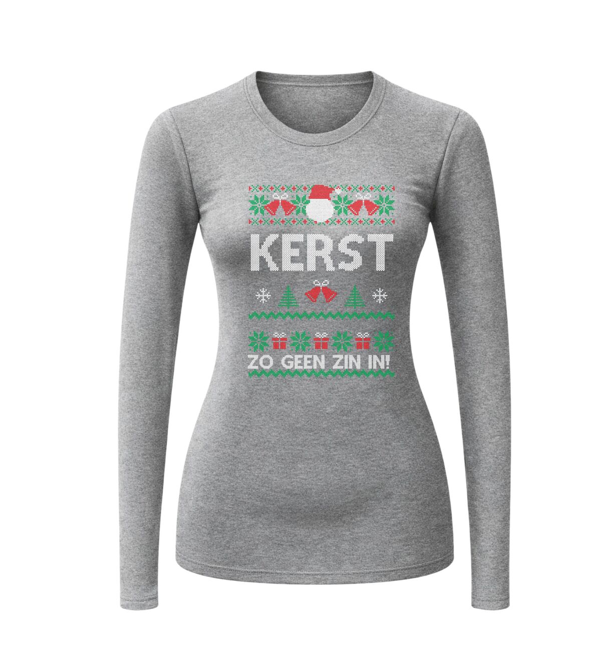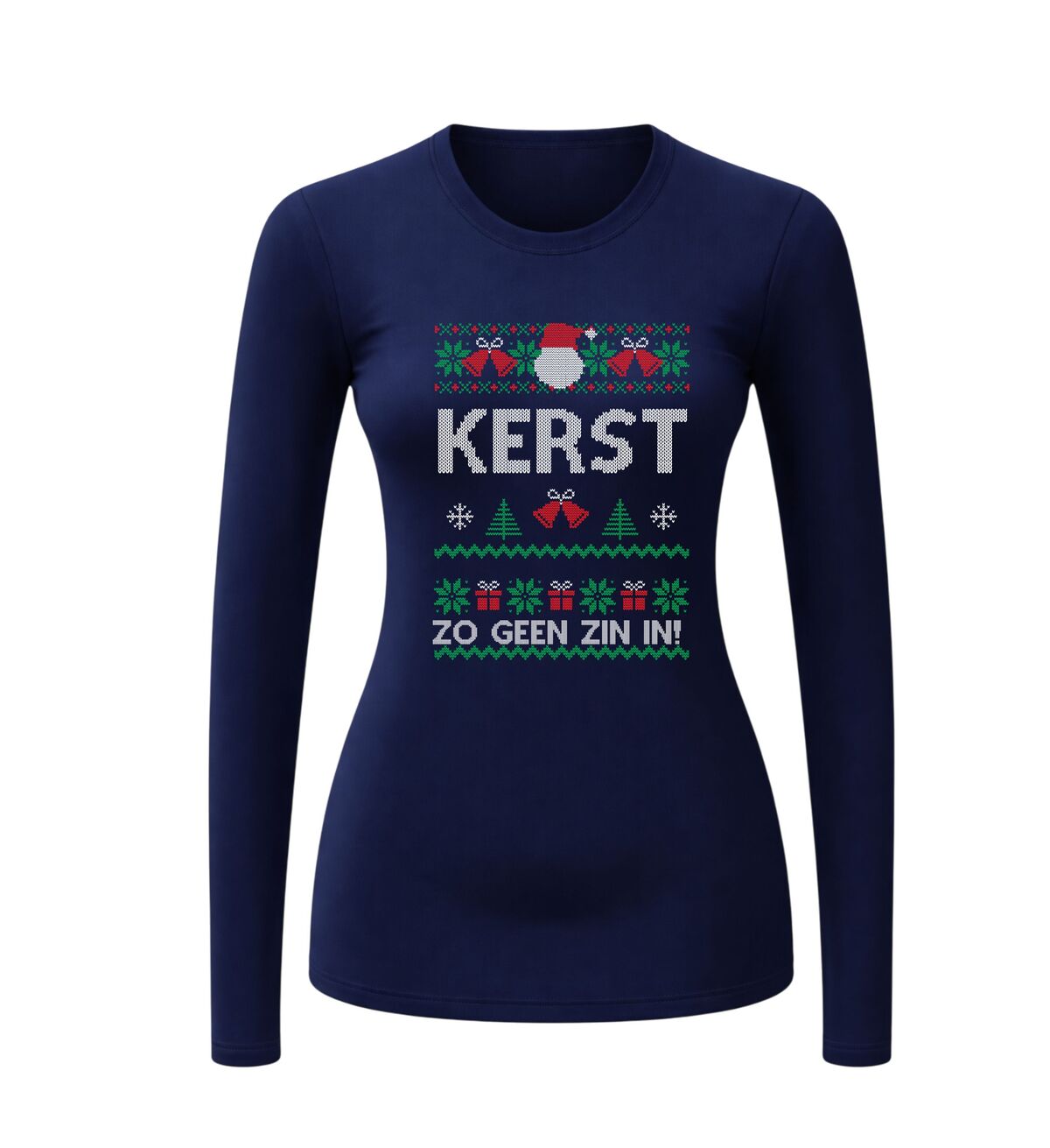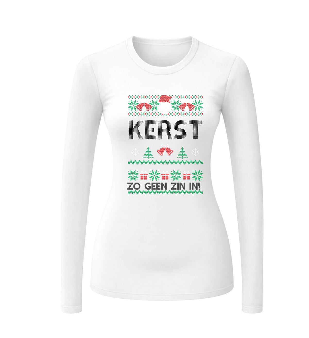 Dit foute kerst T-shirt lange mouw lijkt op een klassieke foute kersttrui met speelse kerstbomen, bellen, sneeuwvlokken en cadeautjes in rood, wit en groen. Met de humoristische tekst "Kerst? Zo geen zin in!" geef je een grappige twist aan het traditionele kerstgevoel. Perfect voor iedereen die de kerstgedachte met een glimlach en een vleugje sarcasme benadert.