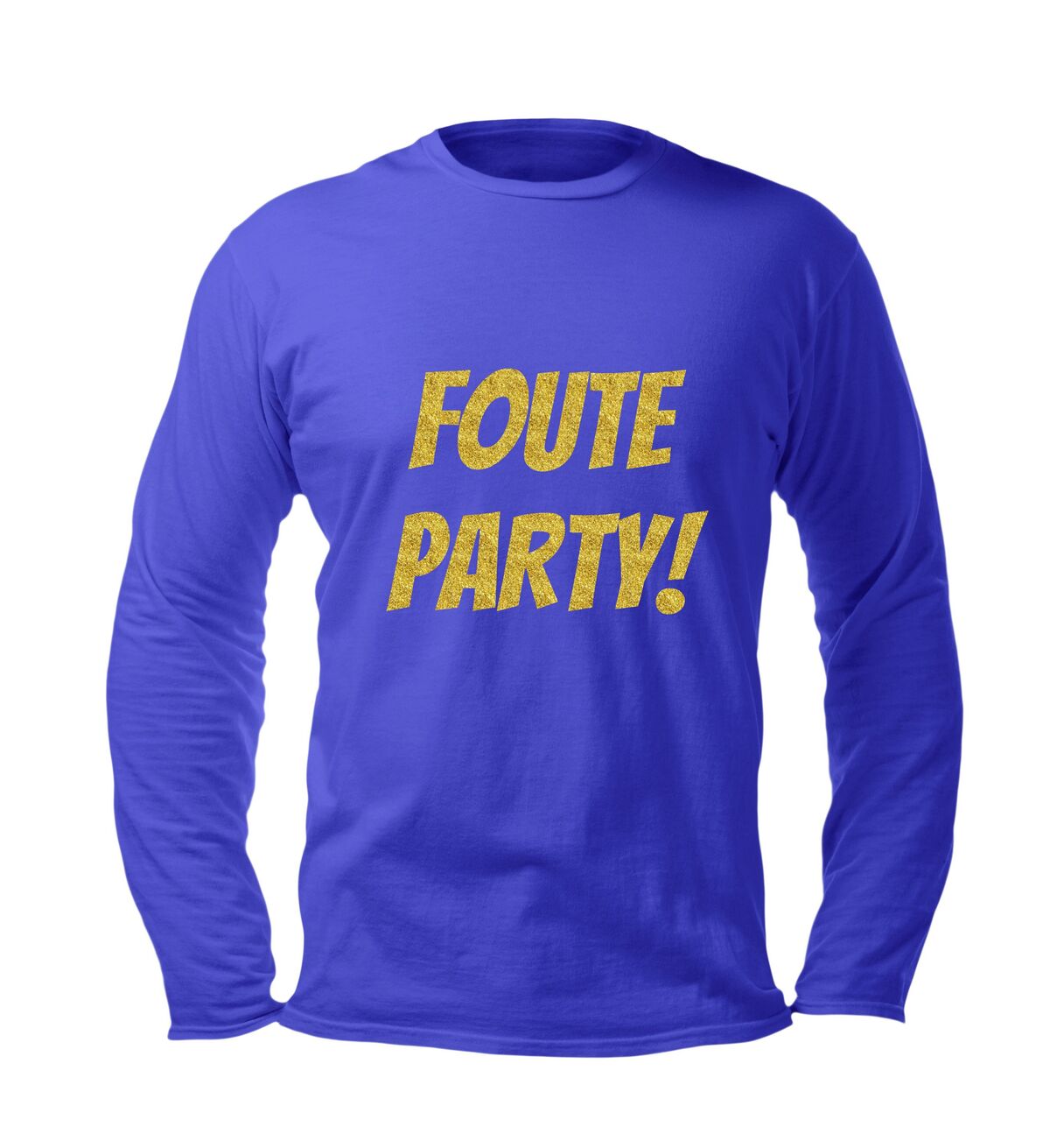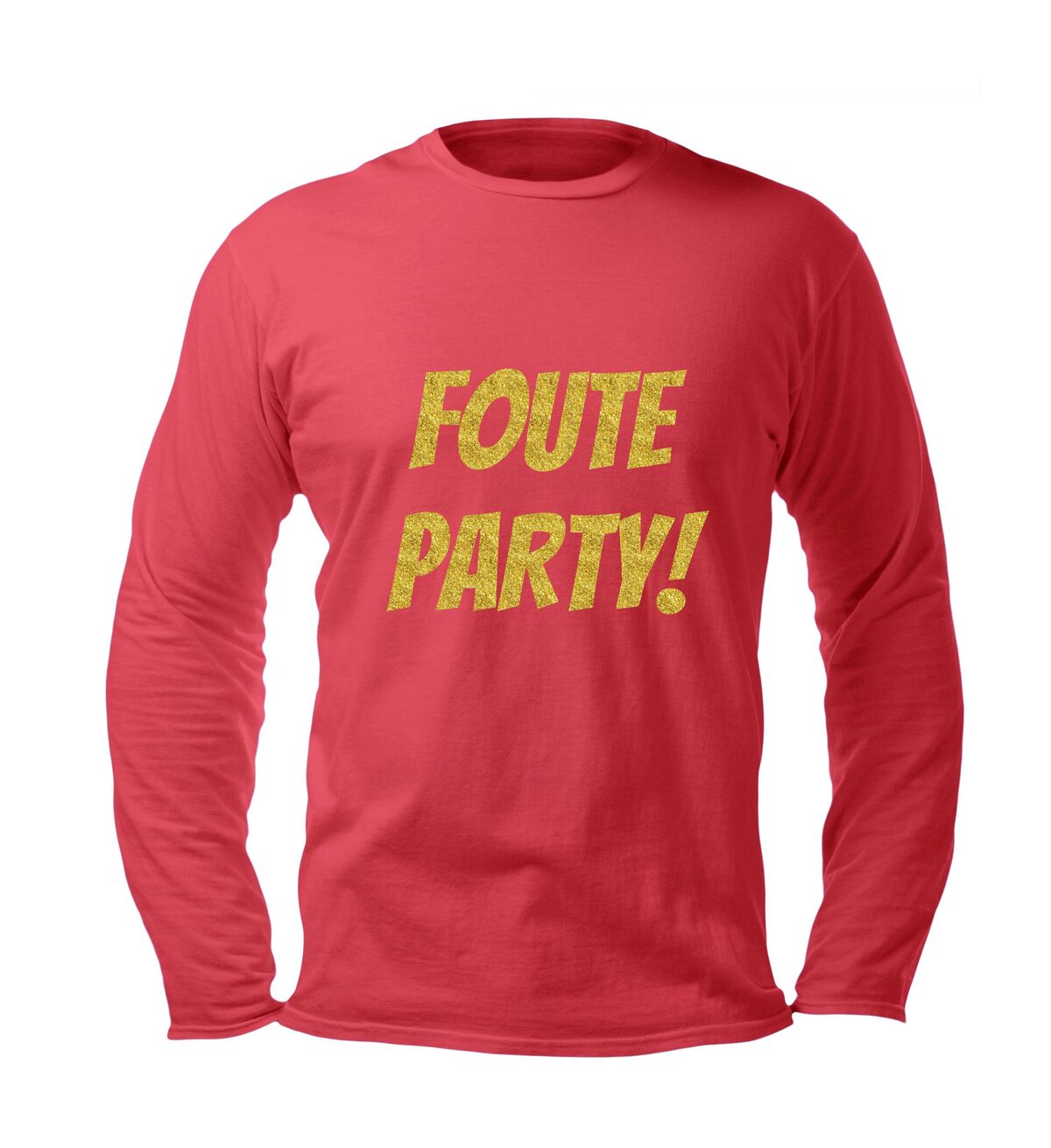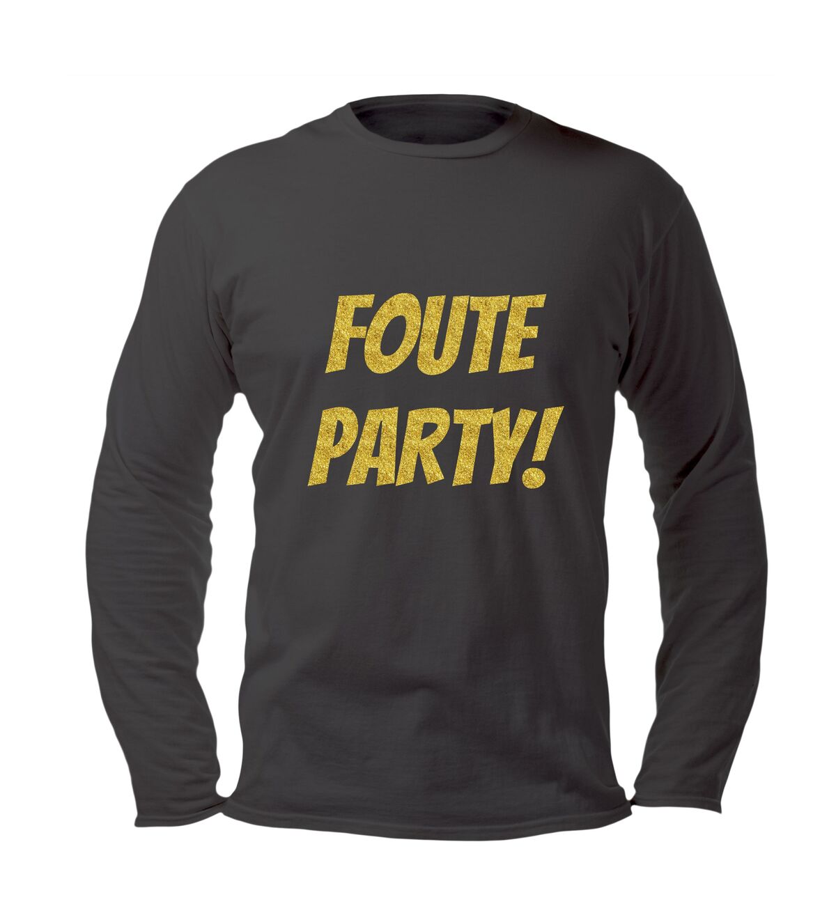 Met deze longsleeve hoef je niet eens meer te zeggen waar je naartoe gaat — de glitter gouden opdruk “Foute Party” zegt al genoeg!