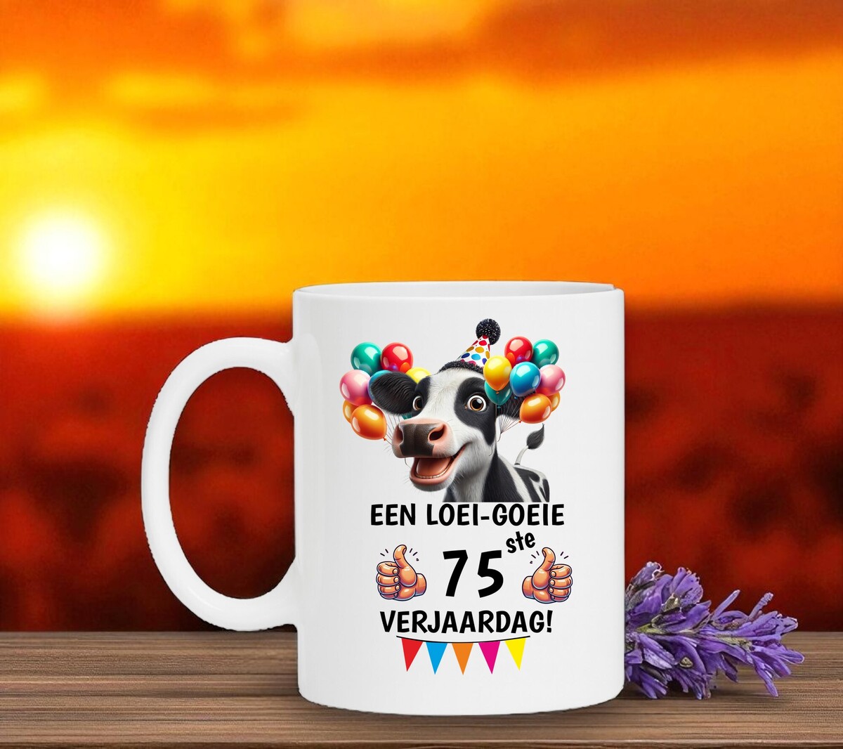 Deze leuke en orginele full colour mok is een leuk cadeau wanneer iemand de leeftijd van 75 jaar bereikt. Zo zet je de 75-jarige extra in het zonnetje en wens je hem of haar een loeigoeie 75ste verjaardag.