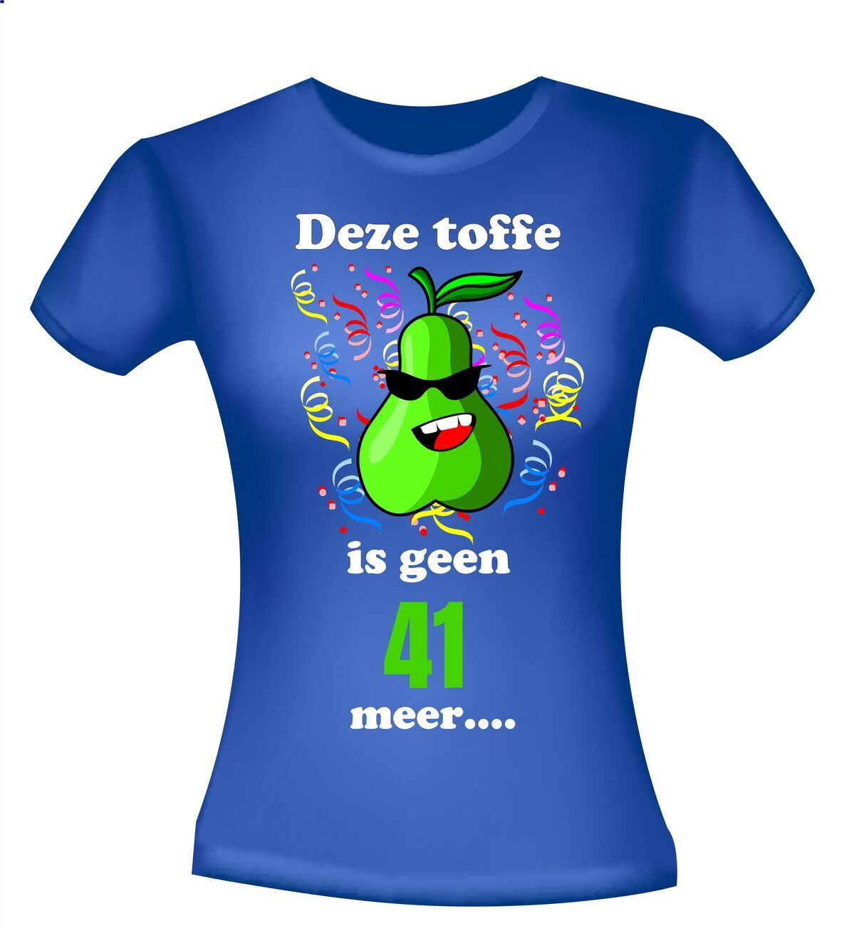 Op zoek naar een leuk en orgineel full colour t-shirt om kado te doen tijdens een 42e verjaardag? Met dit leuke fun shirt en de tekst: deze toffe peer is geen 41 meer kun je voor de dag komen wanneer iemand 42 jaar wordt. Zo zet je de jarige jop nog extra in de schijnwerpers.