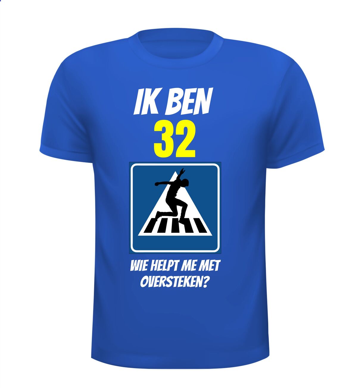 Op zoek na een leuk verjaardag shirt voor een man die zijn 32e verjaardag viert? Dit fun t-shirt is erg leuk om kado te krijgen en te doen tijdens een 32e verjaardag. Op het leeftijd shirt staat de tekst: ik ben 32 wie helpt mij oversteken.