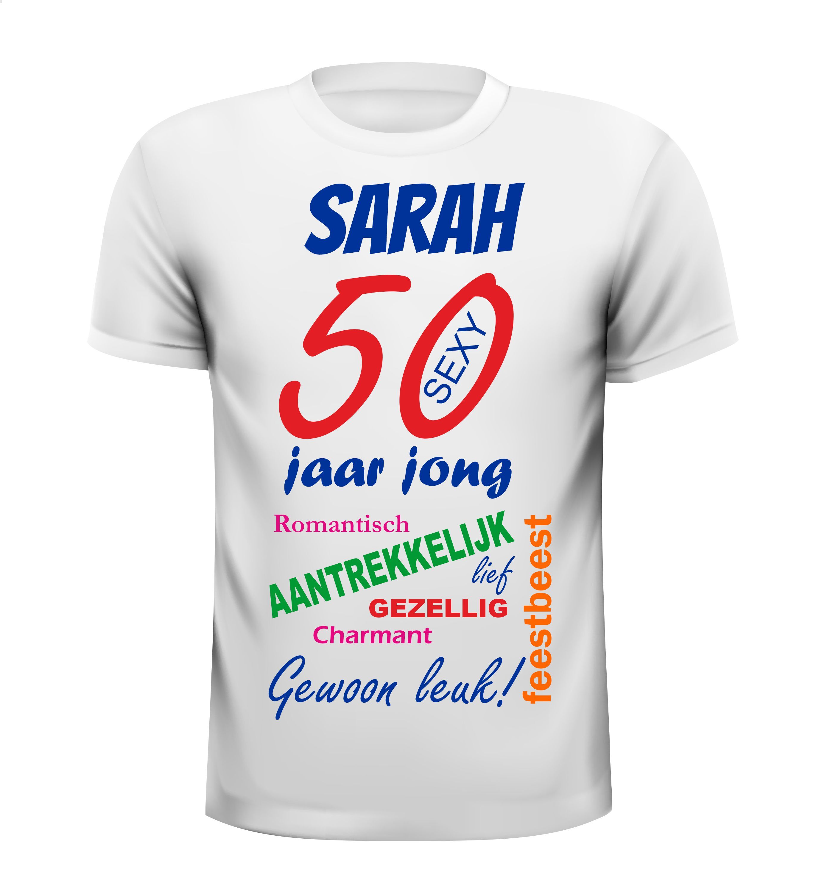 Wit t-shirt voorzien van vrolijk gekleurde opdruk: Sarah 50 jaar jong. Het t-shirt is verfraaid met de volgende vrolijk gekleurde kernwoorden: sexy, romantisch, gezellig, aantrekkelijk, feestbeest, lief, shop-aholic, charmant, gewoon leuk! Grappig T-shirt wat als cadeau artikel een ware topper is!