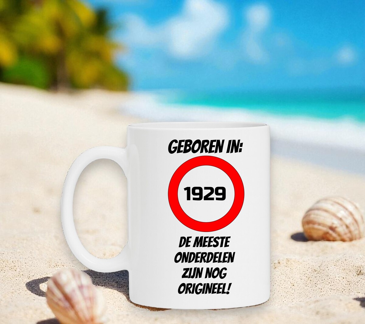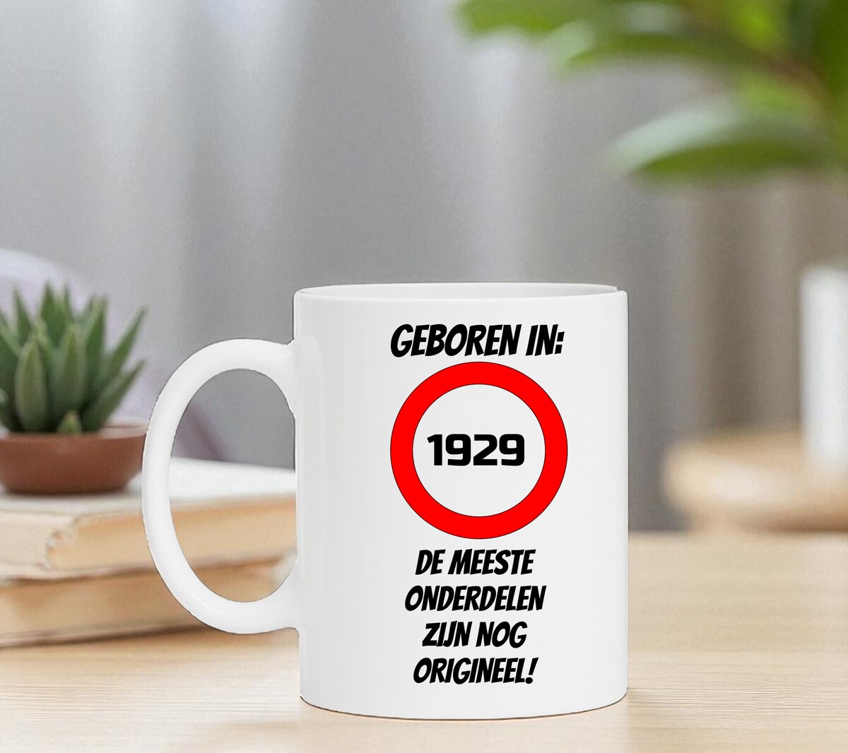 Op deze mok staat de grappige tekst: geboren in 1929. de meeste onderdelen zijn nog orgineel.
