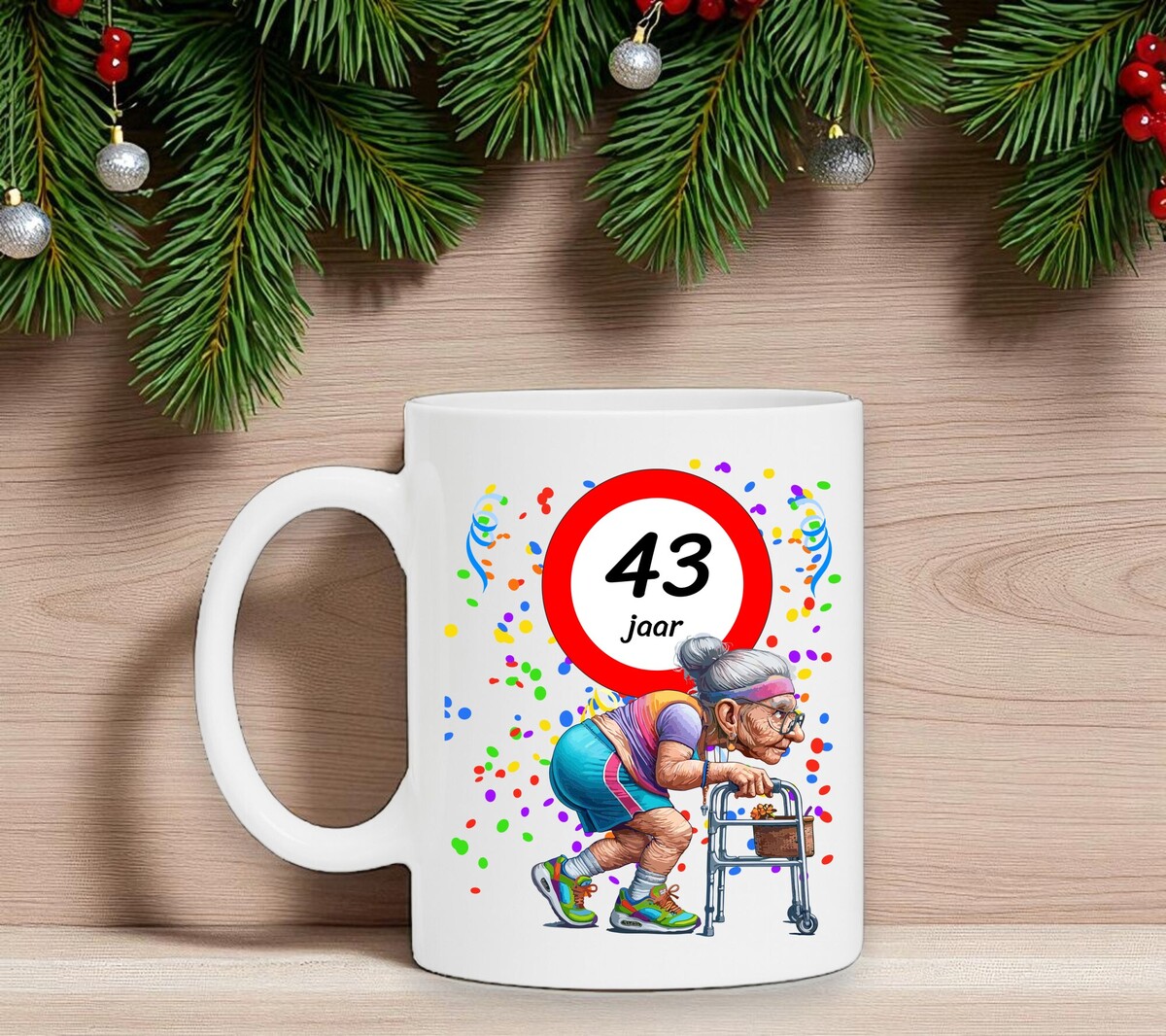 Ben je op zoek naar het perfecte verjaardagscadeau voor een vrouw die haar 43e levensjaar omarmt met een lach? Zoek niet verder! Deze full colour bedrukte mok met de vrolijke afbeelding van een oude vrouw achter een rollator is de ideale mix van humor, stijl en een vleugje zelfspot. Een perfect cadeau voor iemand die weet dat leeftijd slechts een getal is en dat je nooit te oud bent om plezier te hebben!