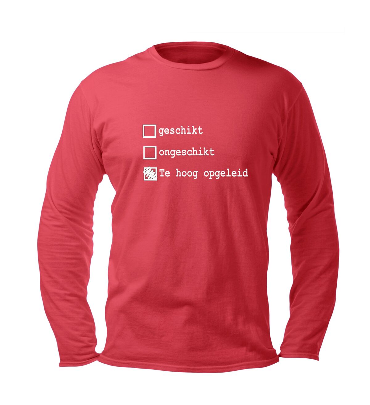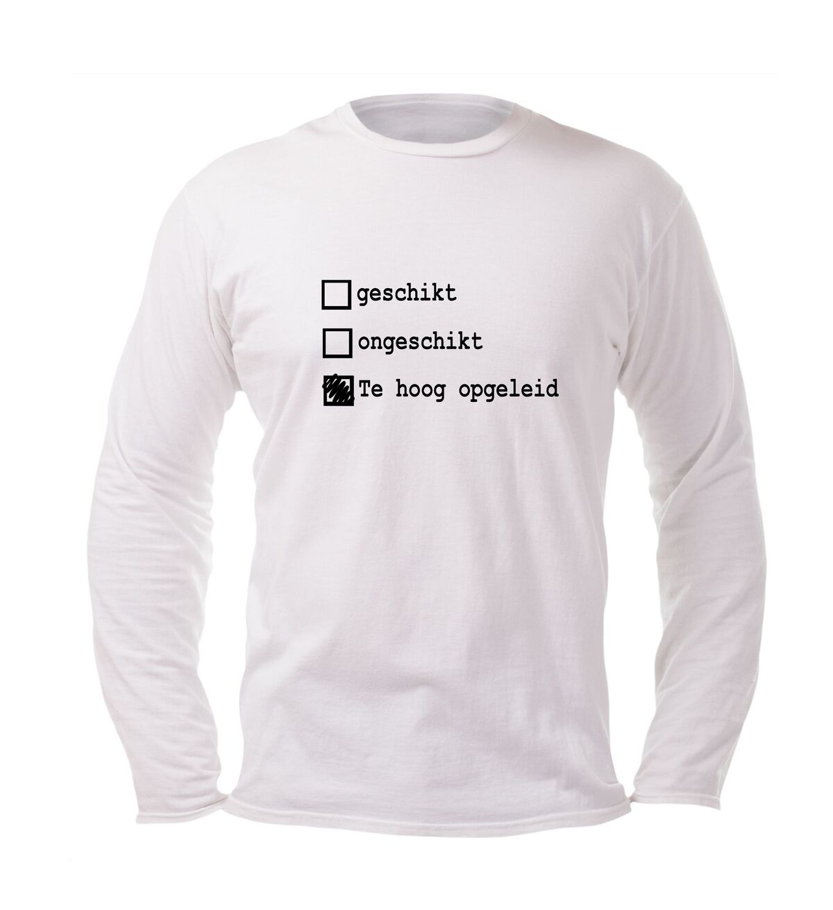 Persiflage op landmacht longsleeve geschik ongeschikt. Maar nu dan met een extra optie : te hoog opgeleid