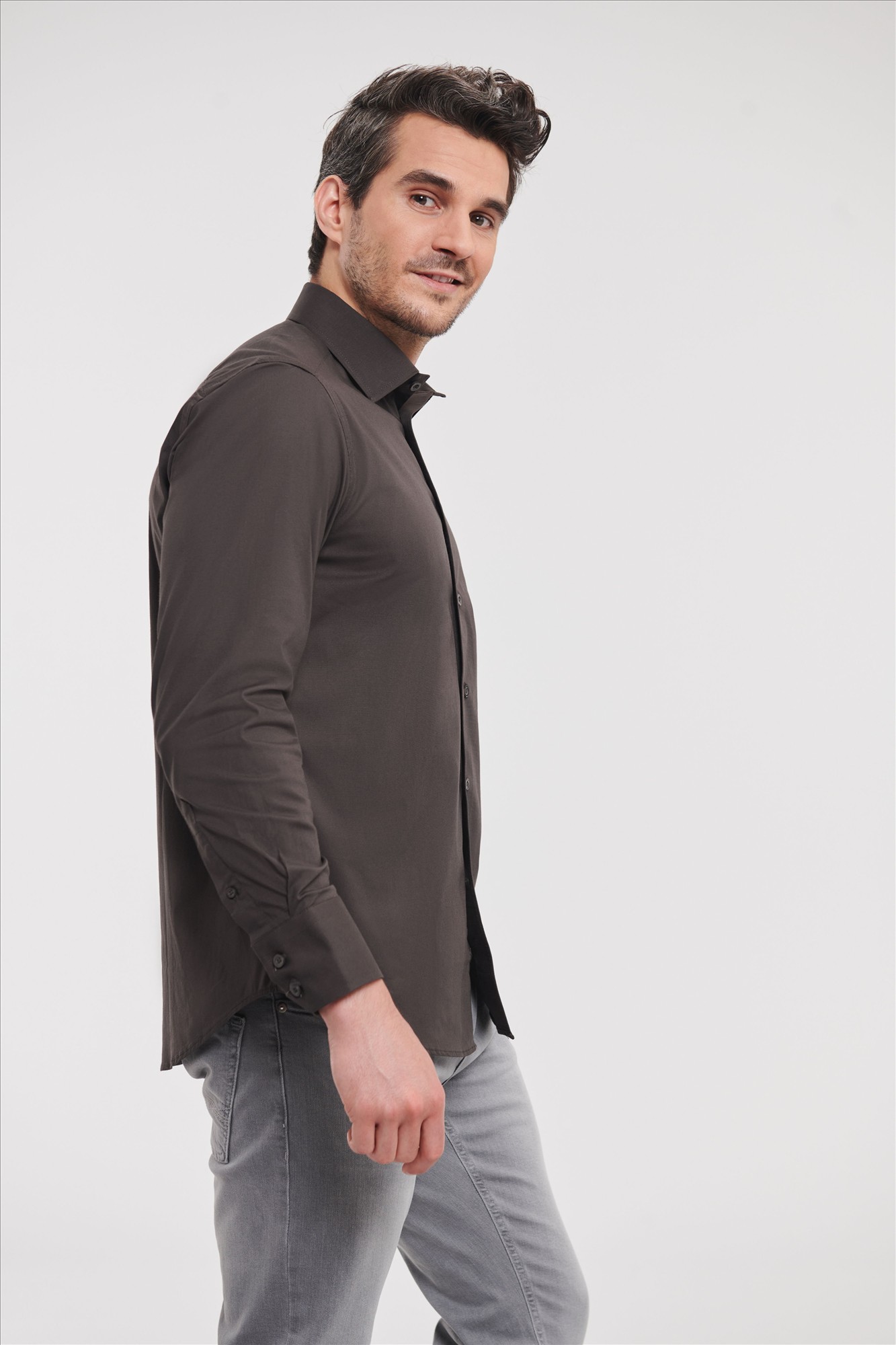 Getailleerd heren overhemd chocolade kleur met ton sur ton knoopjes en stretch. Easy Care. Stretch. Extra verstevigde kraag. Afgeronde verstelbare manchetten met twee knopen en 1 knoop op de manchetsplit. Afgeronde onderboord. Heerlijk hemd om te dragen. Easy care en gaat t/m 4X. Merk: Russell Men LSL Fitted Stretch Shirt. Materiaal:97% Cotton - 3% Elastane Poplin. Dikte: 140 g/m2. Land van herkomst:Bangladesh. De foto van het model dient ter illustratie van de sfeer. Gelieve geen aandacht te besteden aan de kleur.