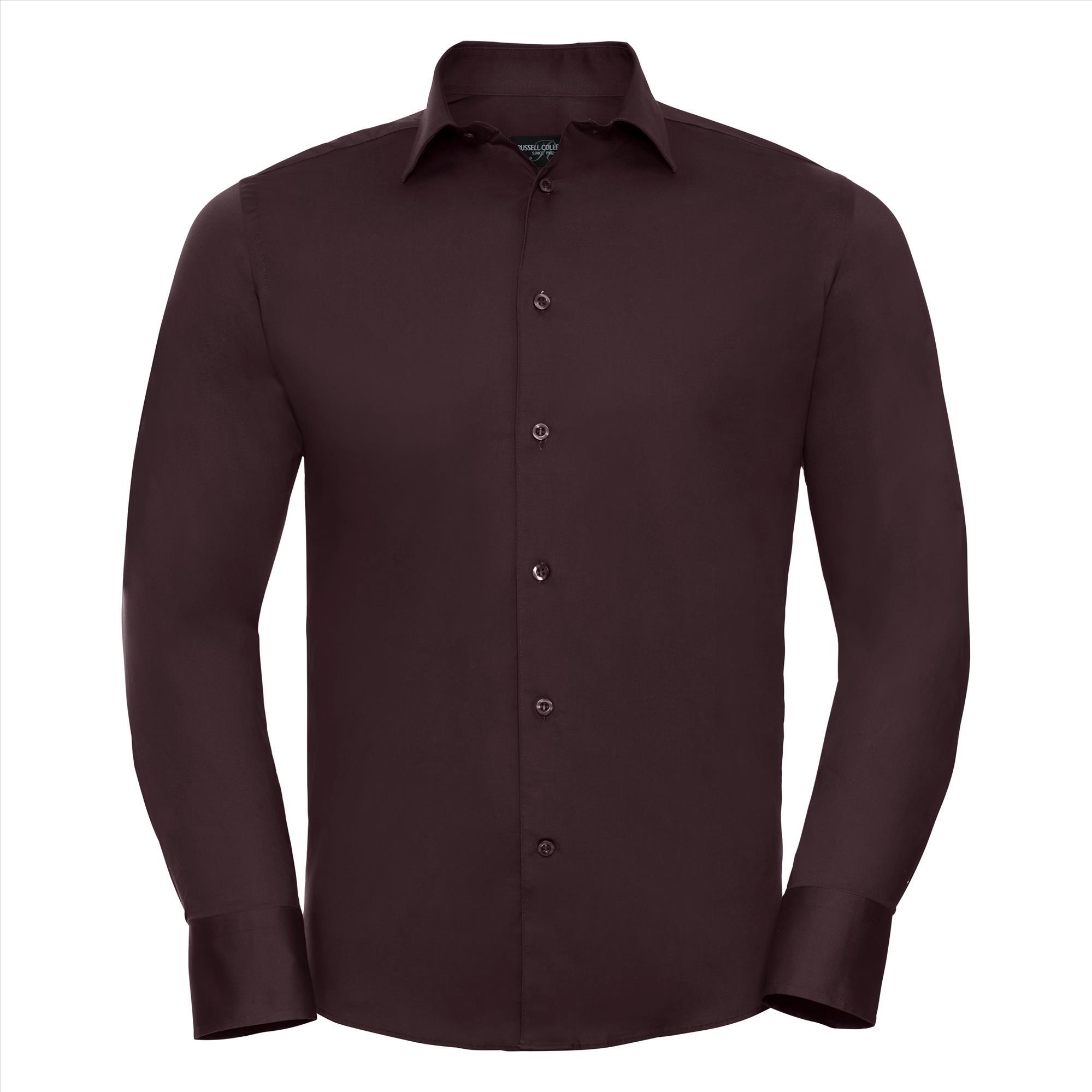 Getailleerd heren overhemd port met ton sur ton knoopjes en stretch. Easy Care. Stretch. Extra verstevigde kraag. Afgeronde verstelbare manchetten met twee knopen en 1 knoop op de manchetsplit. Afgeronde onderboord. Heerlijk hemd om te dragen. Easy care en gaat t/m 4X. Merk: Russell Men LSL Fitted Stretch Shirt. Materiaal:97% Cotton - 3% Elastane Poplin. Dikte: 140 g/m2. Land van herkomst:Bangladesh. De foto van het model dient ter illustratie van de sfeer. Gelieve geen aandacht te besteden aan de kleur.