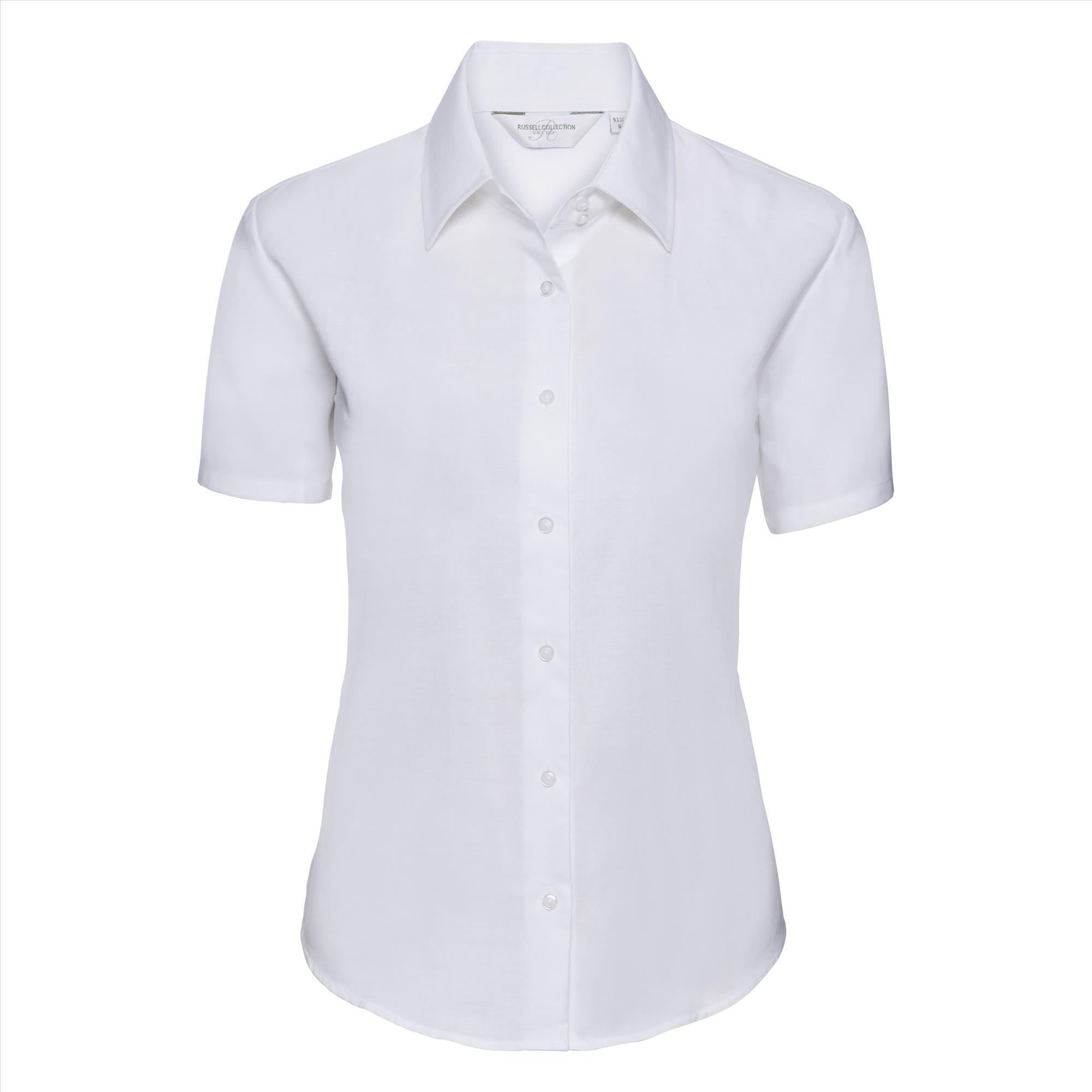 Getailleerde dames blouse korte mouw met klassieke kraag. Stijlvolle dames blouse korte mouw met modern halfronde zoomafwerking heeft coupenaden in voor- en achterpand voor een elegantere lijn. Sjieke blouse voor zakelijke en prive gelegenheden. Easy care en gaat t/m 6XL. Merk:Russell Ladies Shortsleeve Clas. Oxford Shirt. Materiaal:70% Cotton - 30% Polyester Oxford. Dikte: 130 g/m2. Land van herkomst:Bangladesh. De foto van het model dient ter illustratie van de sfeer. Gelieve geen aandacht te besteden aan de kleur.