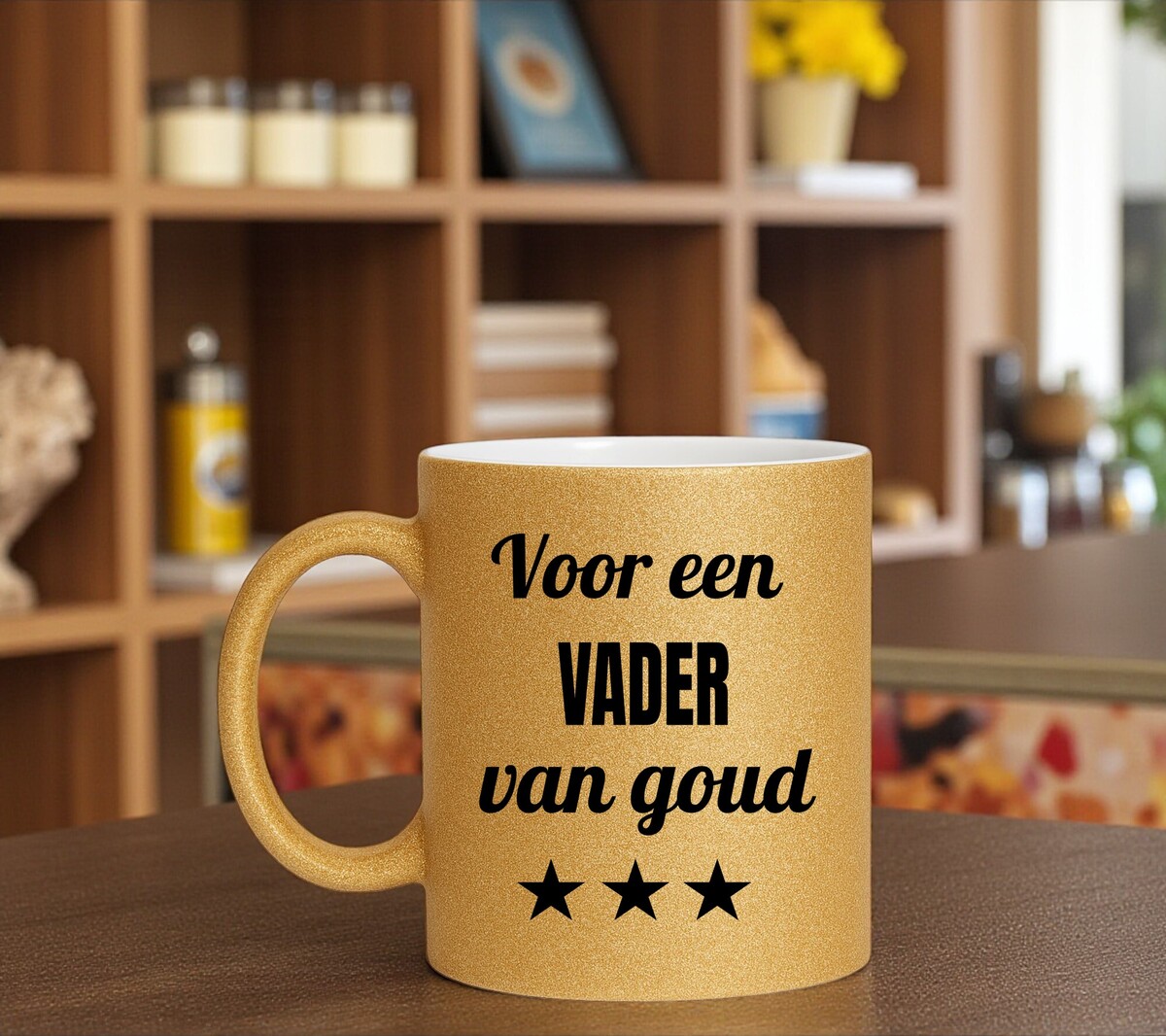 Glitter gouden koffie of thee mok met de opdruk Voor een vader van goud. Handwas aanbevolen! Microgolfbestendig De mok heeft een hoogte van 96mm en een diameter van 80mm.