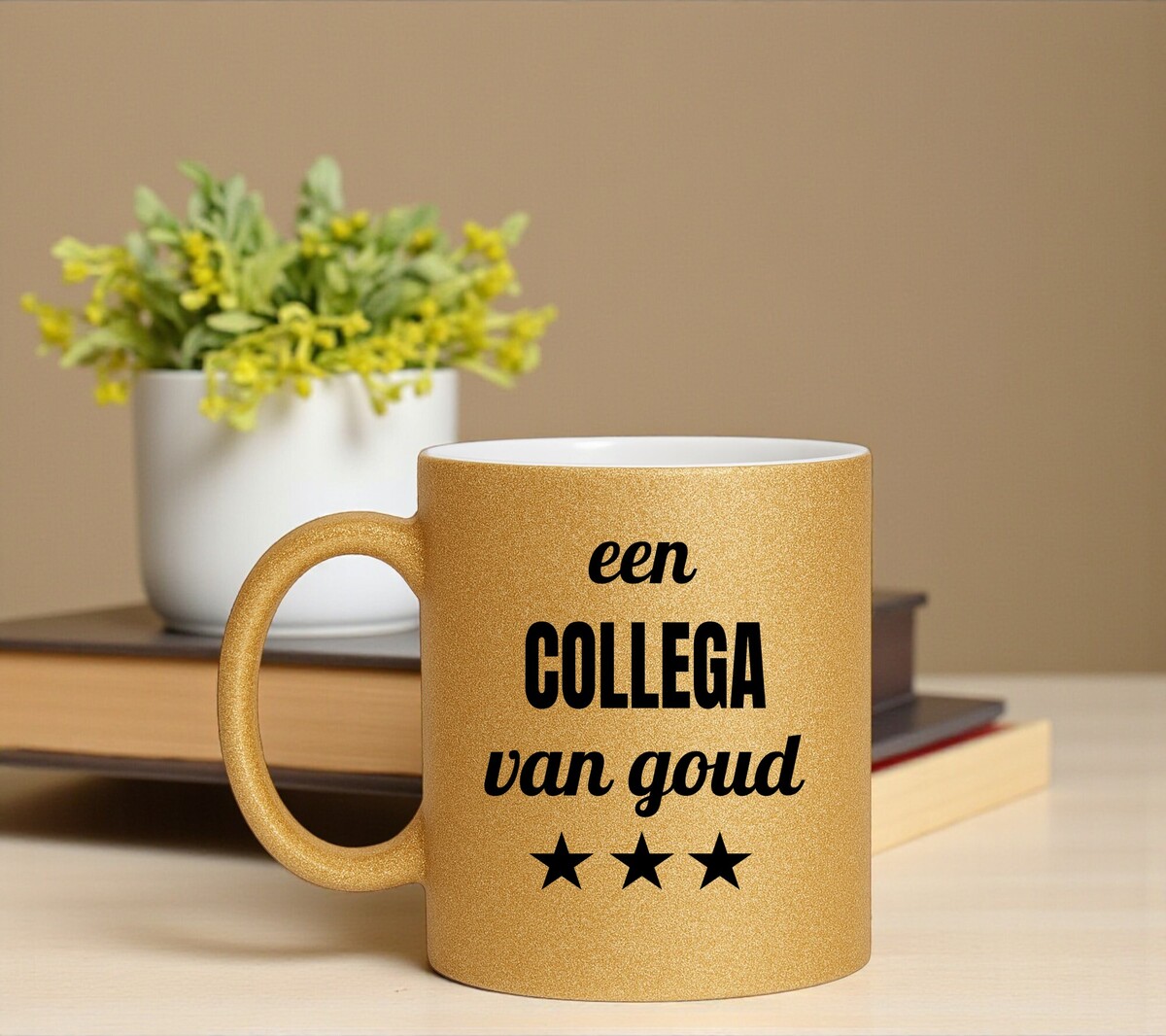 Orginele glitter mok in het goud met de tekst: Een collega van goud.