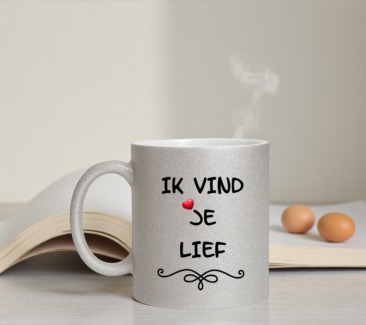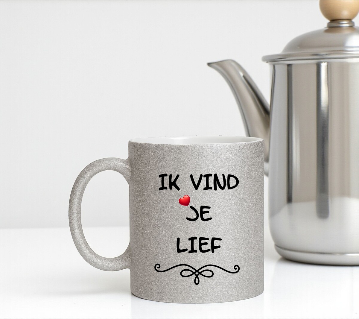 Ben je op zoek naar een origineel, betaalbaar en liefdevol Valentijns cadeau dat direct een glimlach oproept? Dan is deze glitter mok met de tekst ik vind je lief een uitstekende keuze. Door de combinatie van glans, eenvoud en emotie is dit een product dat perfect past binnen Valentijnsdag decoratie en cadeaus en goed vindbaar is voor iedereen die zoekt naar een romantische mok, glitter mok of lief cadeau voor Valentijn.
