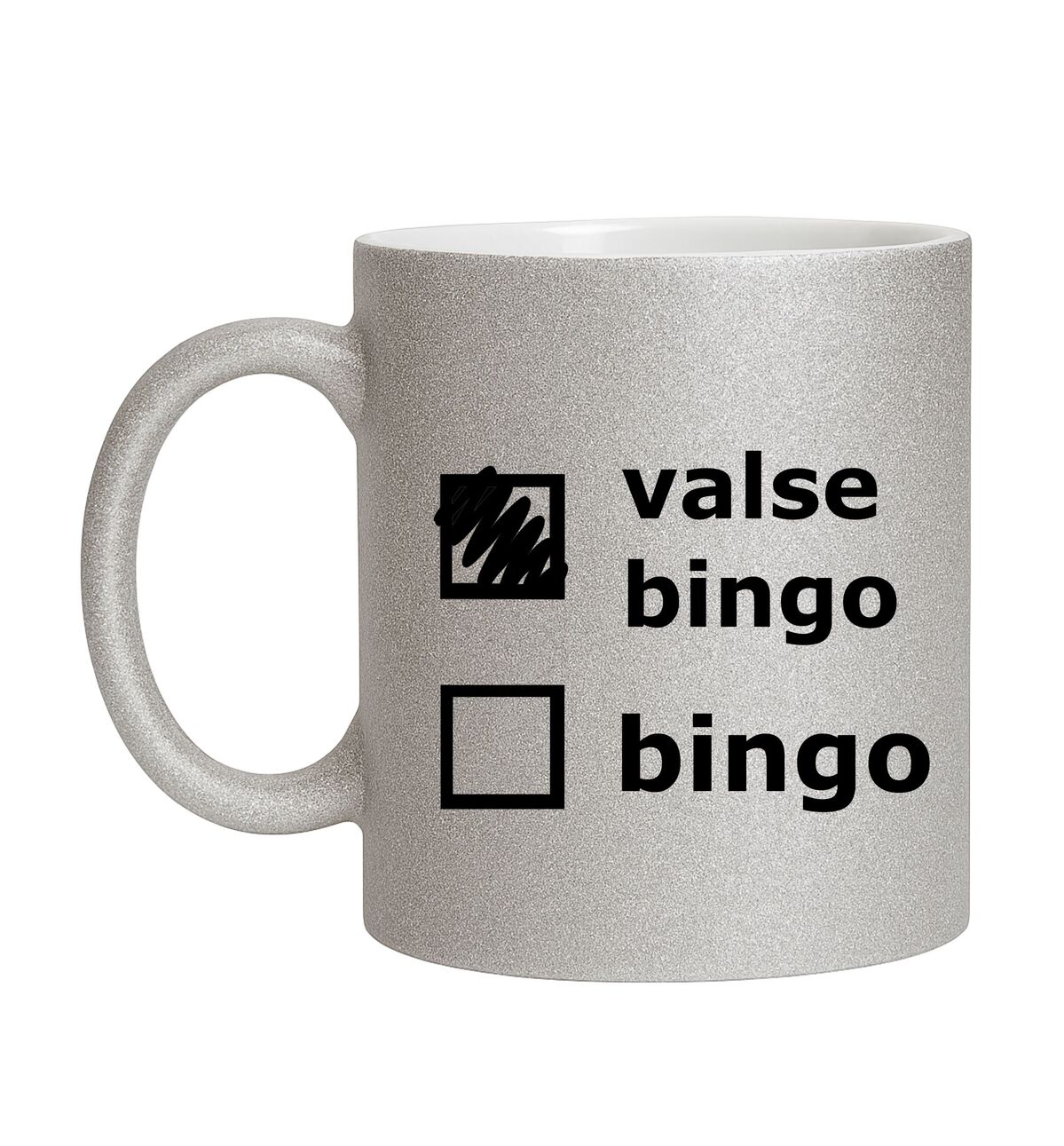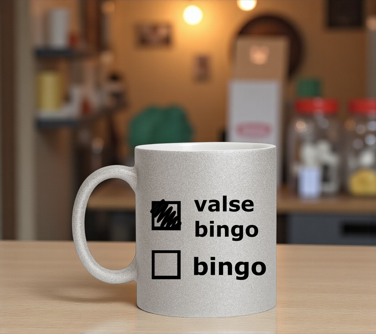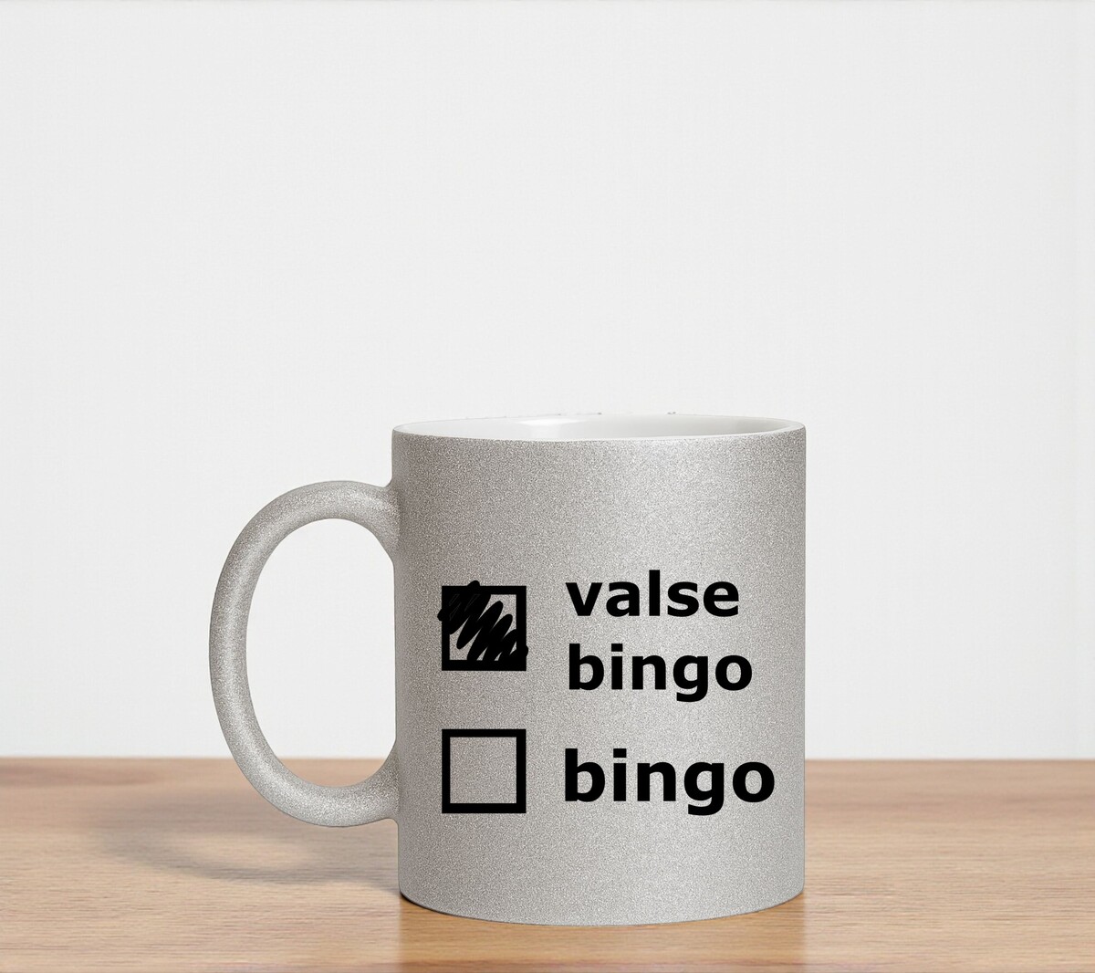 Deze zilveren glitter mok met de tekst “Bingo / Valse Bingo” en het aangekruiste vakje bij Valse Bingo is hét ultieme cadeau voor iedereen die de spanning tijdens bingo graag een beetje opschudt. Of je nu die ene speler bent die nét te vroeg “BINGO!” roept, of gewoon houdt van een goede grap — deze mok past perfect bij jou (of bij degene die altijd voor opschudding zorgt.