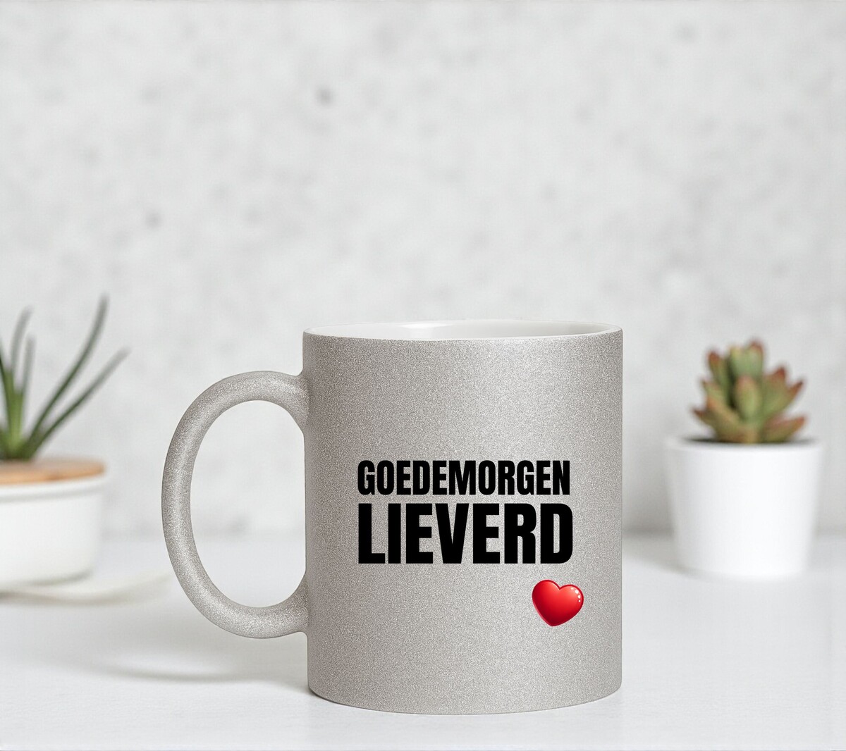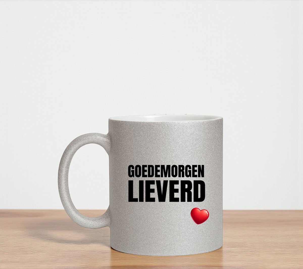 Begin de dag met een beetje liefde en een flinke dosis glitter. Deze schitterende zilveren glitter mok met de tekst “Goedemorgen lieverd” en een lief hartje maakt van elk ochtendmoment iets bijzonders. Nog vóór de eerste slok koffie of thee tovert deze mok een glimlach op het gezicht van degene die ’m vasthoudt.
